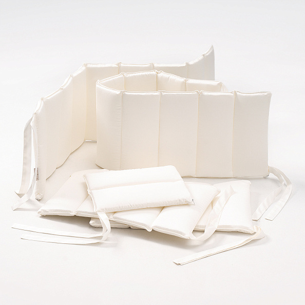 Сатиновая премиальная ткань бортиков гладкая и нежная, как шелк. Она не теряет яркость цвета после многократных стирок и хорошо разглаживается. Внутреннее наполнение бортиков - гипоаллергенный материал холлкон. Подушечки из холлкона хорошо пропускают воздух, прекрасно держат форму и не деформируются в процессе эксплуатации.