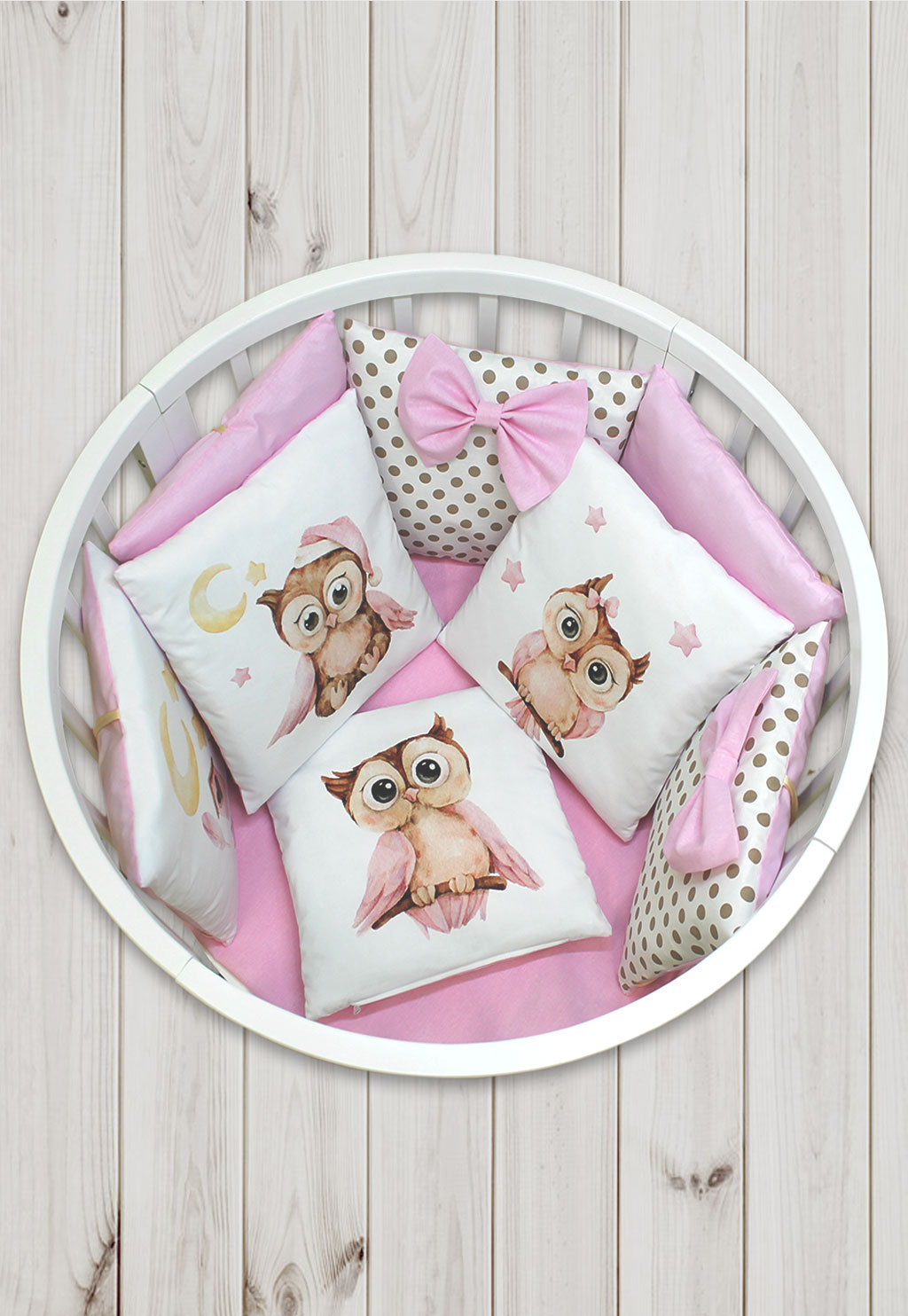 Комплект в кроватку Пухлики 18 предметов, с балдахином, с принтом (Совушка - розовый)