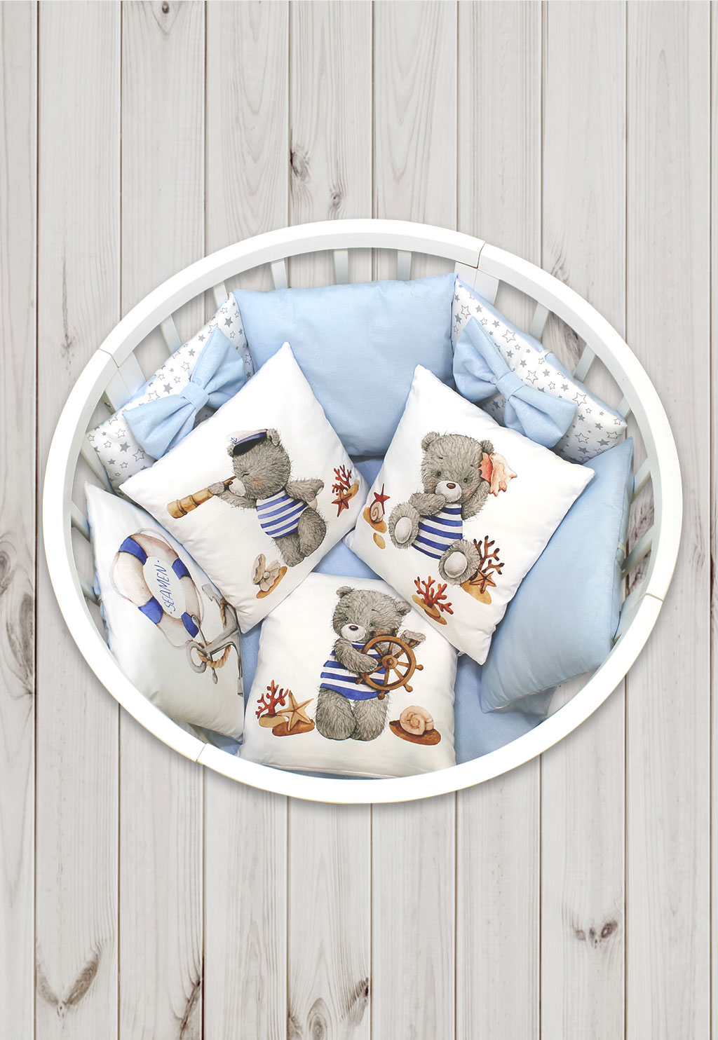 Комплект в кроватку Пухлики 18 предметов, с балдахином, с принтом (Мишка морячок - голубой)