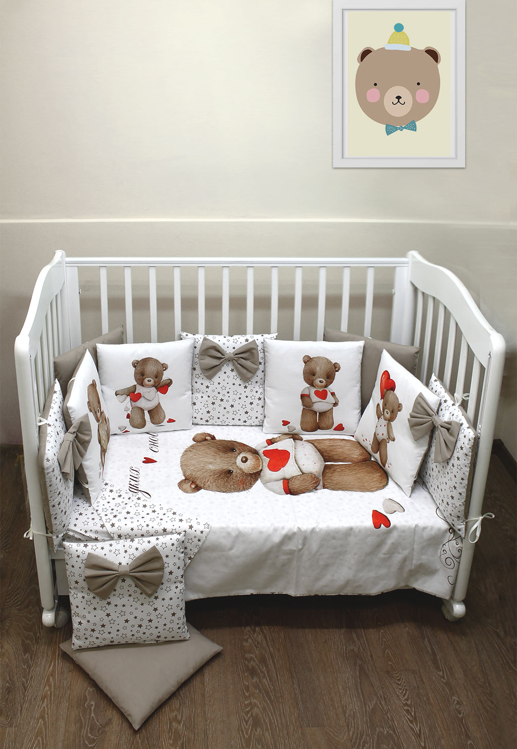 Комплект в кроватку Пухлики 18 предметов, с балдахином, с принтом (Мишка юнга - капучино)