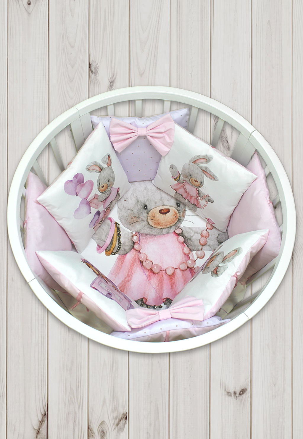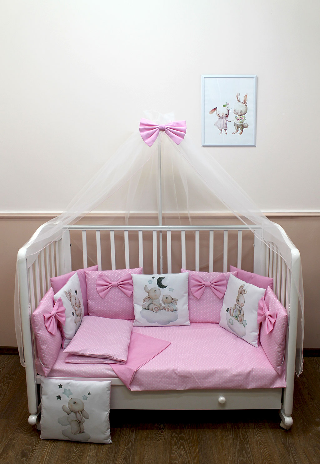 Комплект в кроватку Пухлики 18 предметов, с балдахином, с принтом (Зайка модница - розовый)