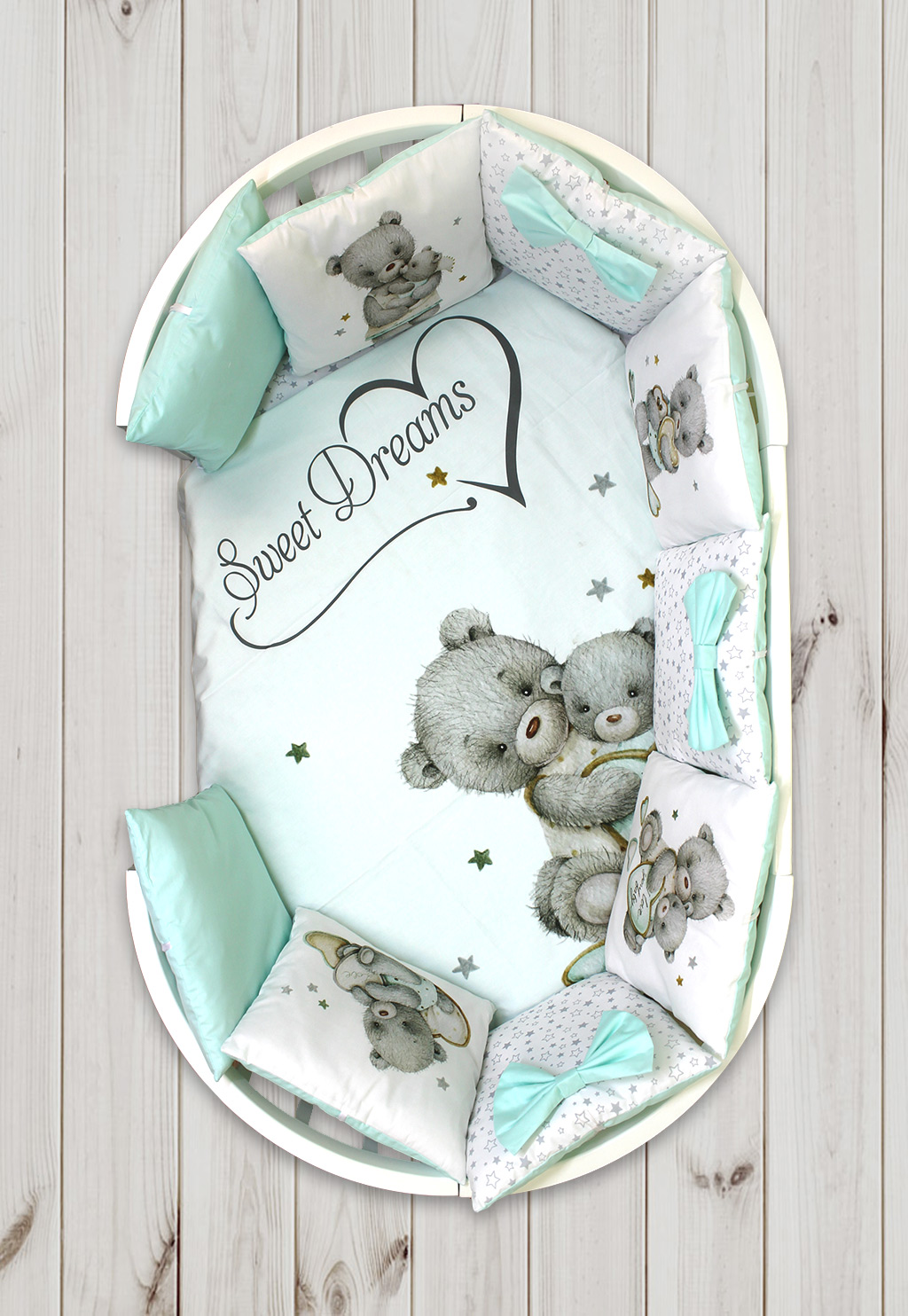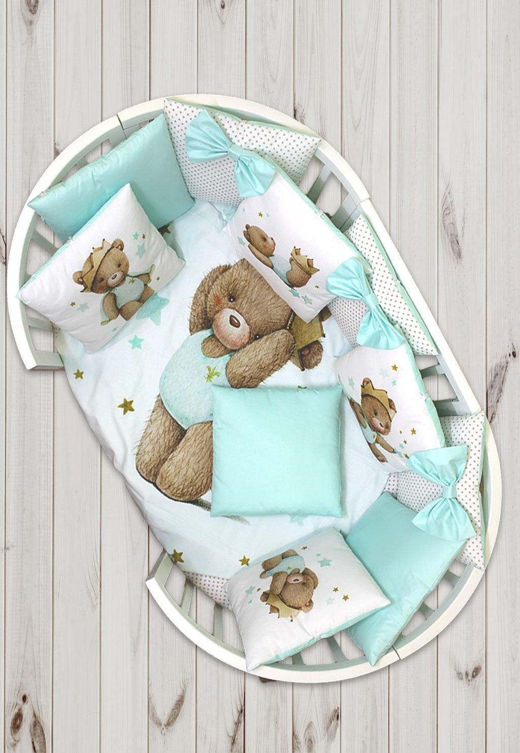 Комплект в кроватку Пухлики 18 предметов, с балдахином, с принтом (Мишутка принц - салатовый)