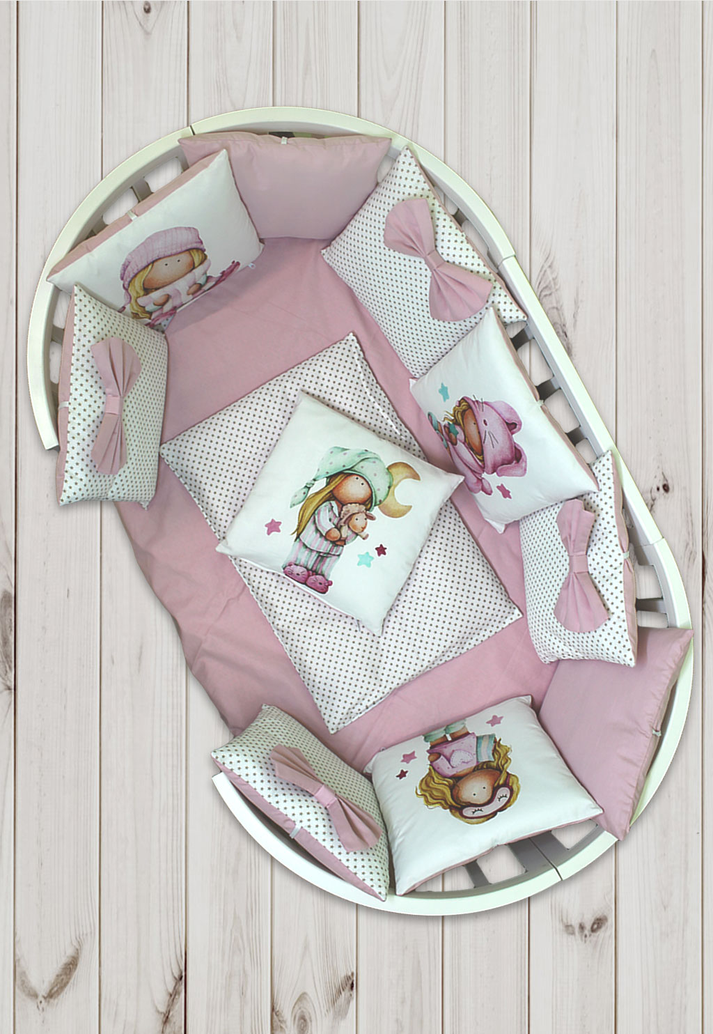Комплект в кроватку Пухлики 18 предметов, с балдахином, с принтом (Кукла Миланья - розовый)