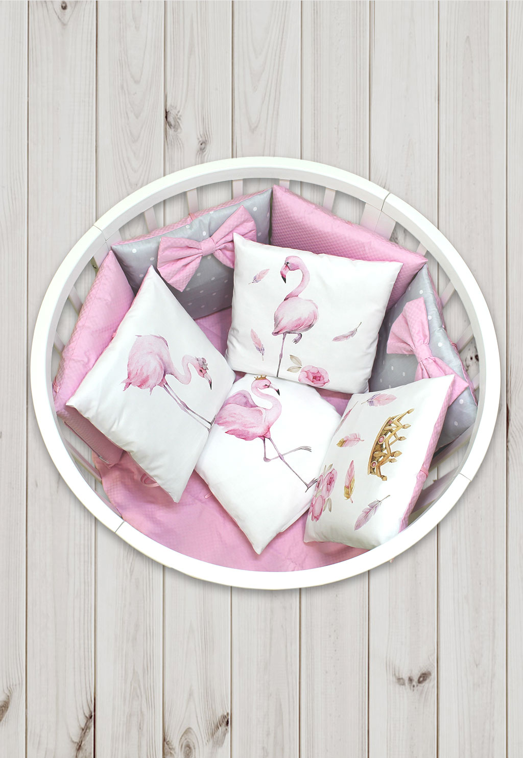 Комплект в кроватку Пухлики 18 предметов, с балдахином, с принтом (Фламинго - розовый)