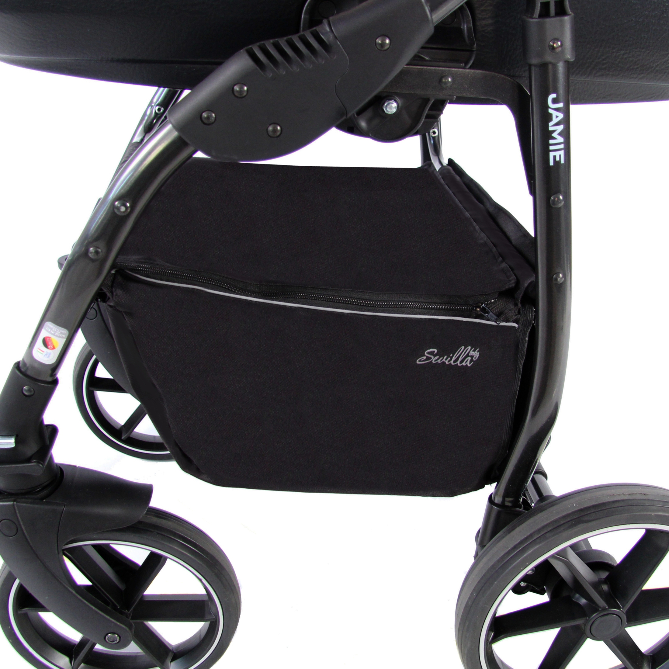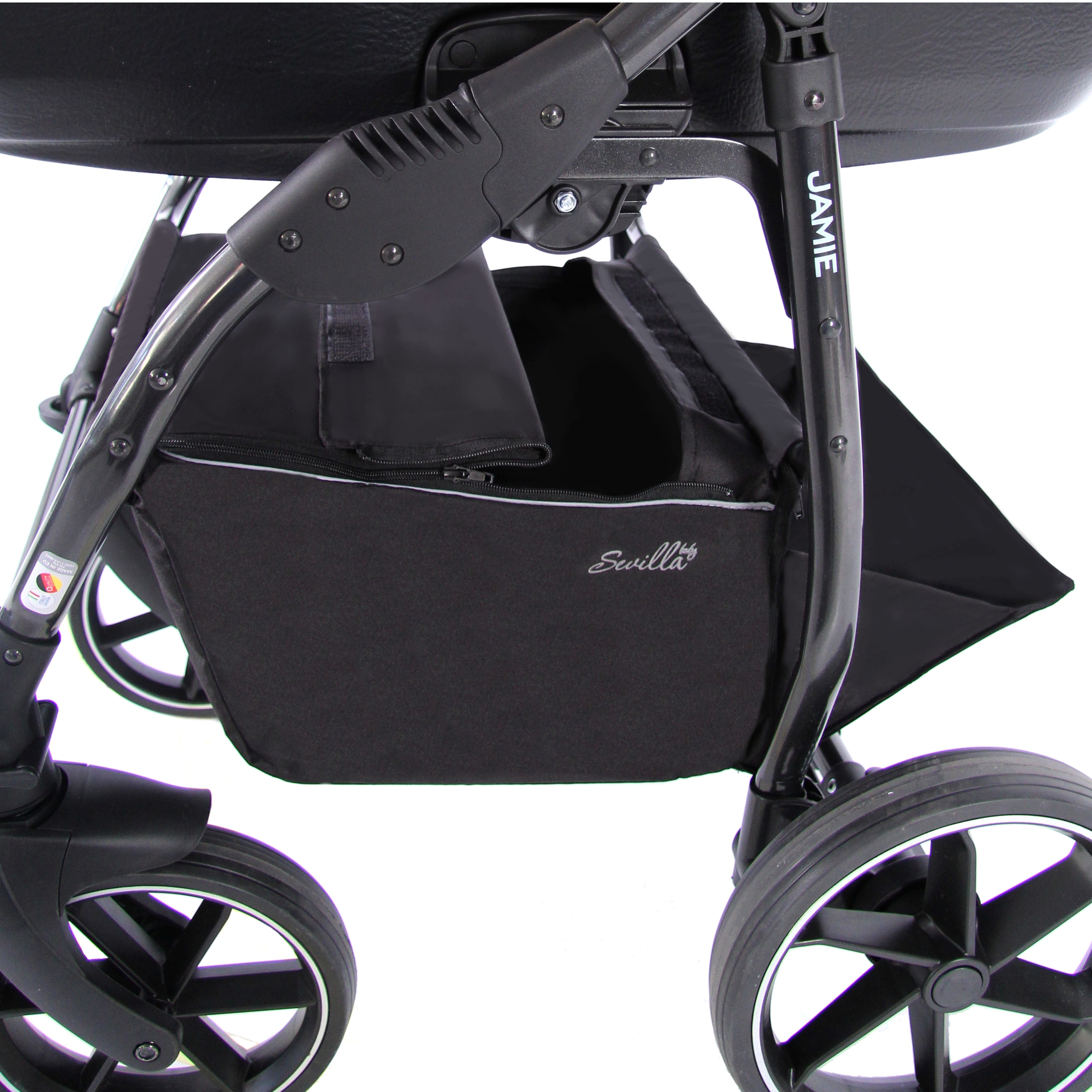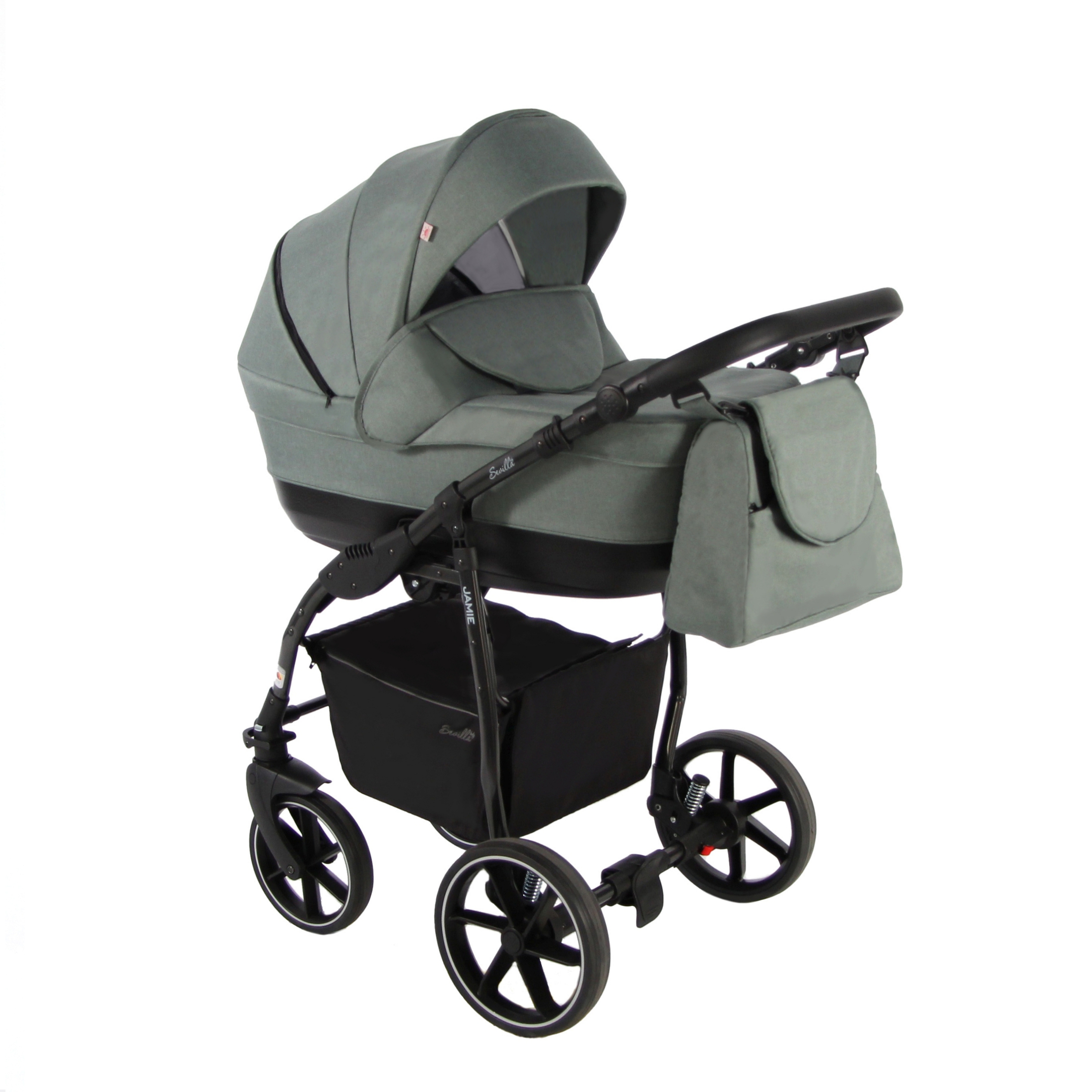 Коляска укомплектована стильной вместительной сумкой для мамы, москитной сеткой, плотным дождевиком, пеленальным ковриком, закрытой корзиной для покупок с удобными вариантами доступа – открывающаяся при помощи замка крышка, либо более быстрый вариант – откидная боковая часть на магните со стороны оси.