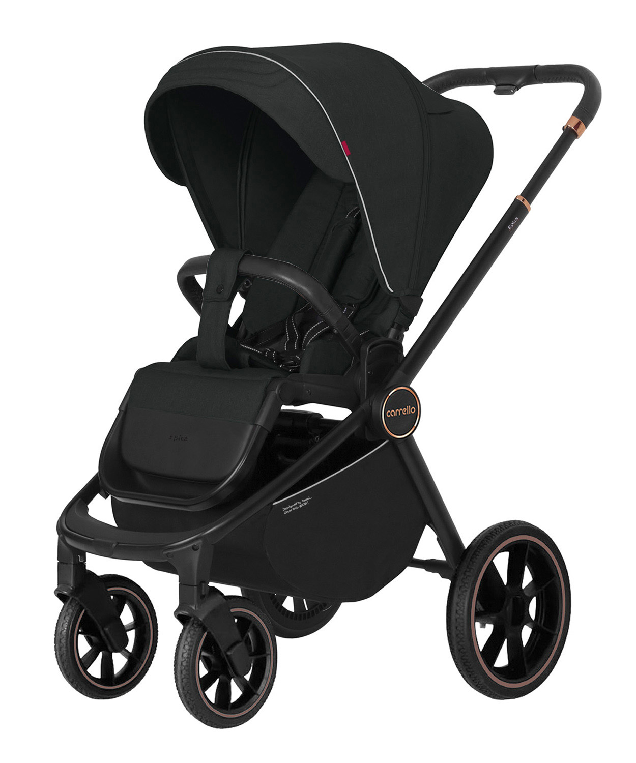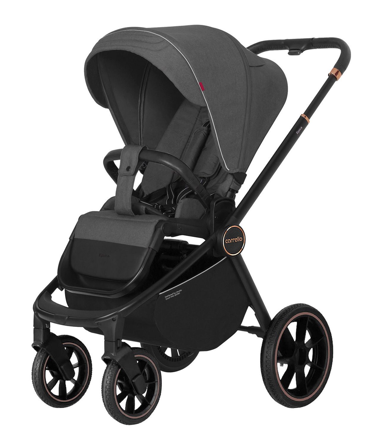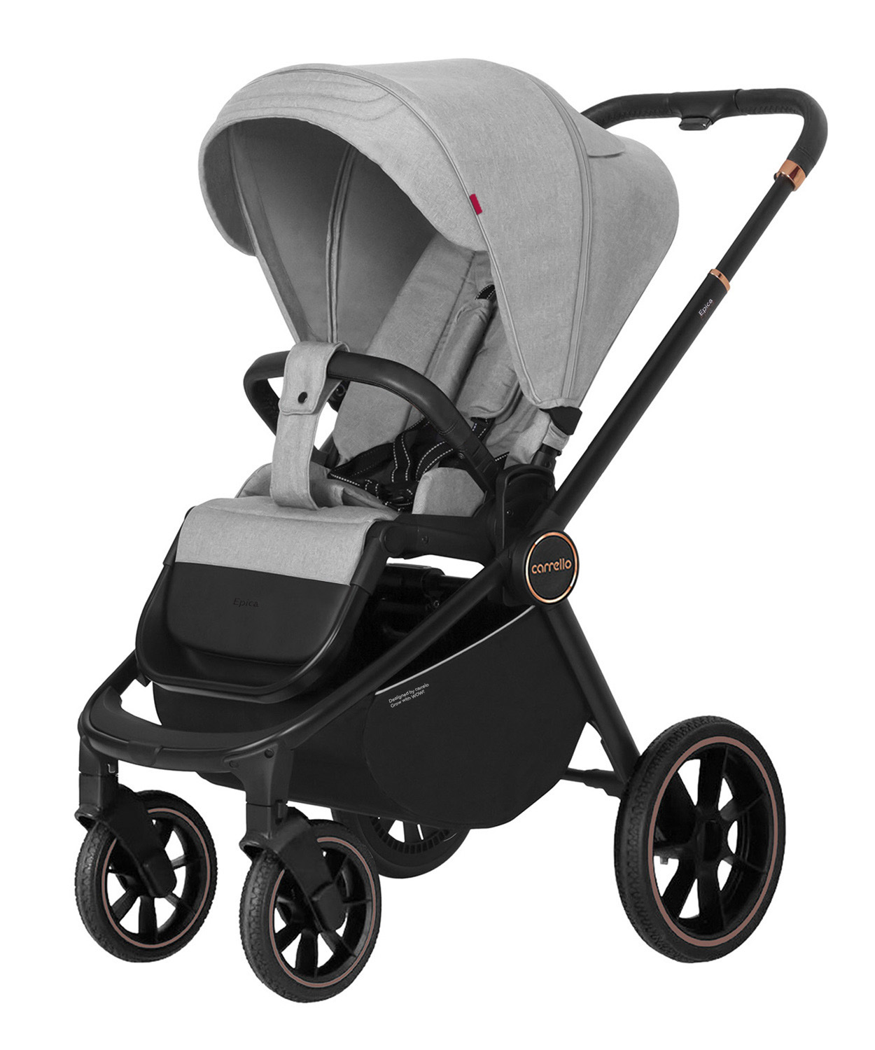 Рама коляски сделана на отлично: она мало весит, компактно складывается, послушная и просто великолепно рулится! Однако мы испытали её и считаем важным предупредить, что лучше всего она больше подойдёт для городского использования. Большой выбор модных оттенков и стильная рама в чёрном цвете выделит вас среди стандартных колясок. Колёса здесь довольно большие и резиновые. Амортизация находится на задней оси сбоку, тут она адаптивная – чем больше вес малыша, тем мягче она становится. Carrello Epica комплектации 3 в 1 рассчитана на любой рост родителей: у неё телескопическая ручка, а задняя ось находится под креслом (это значит, что даже высокий папа не будет спотыкаться при быстрой ходьбе).