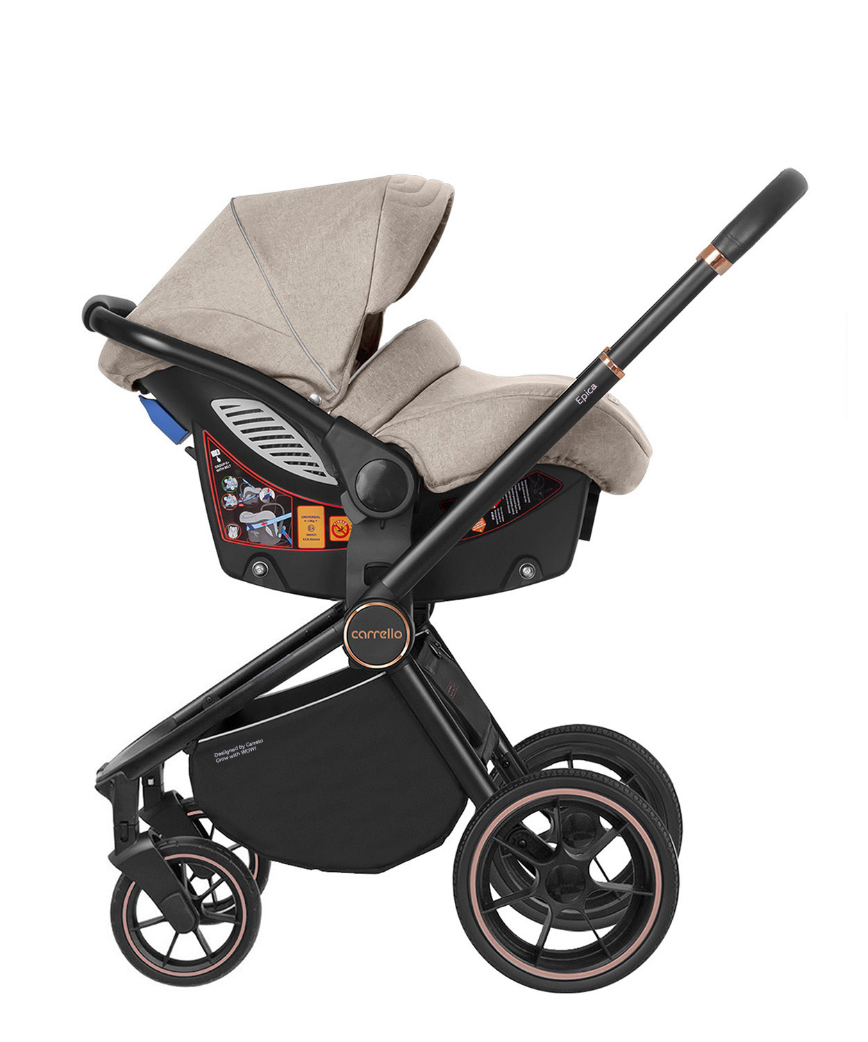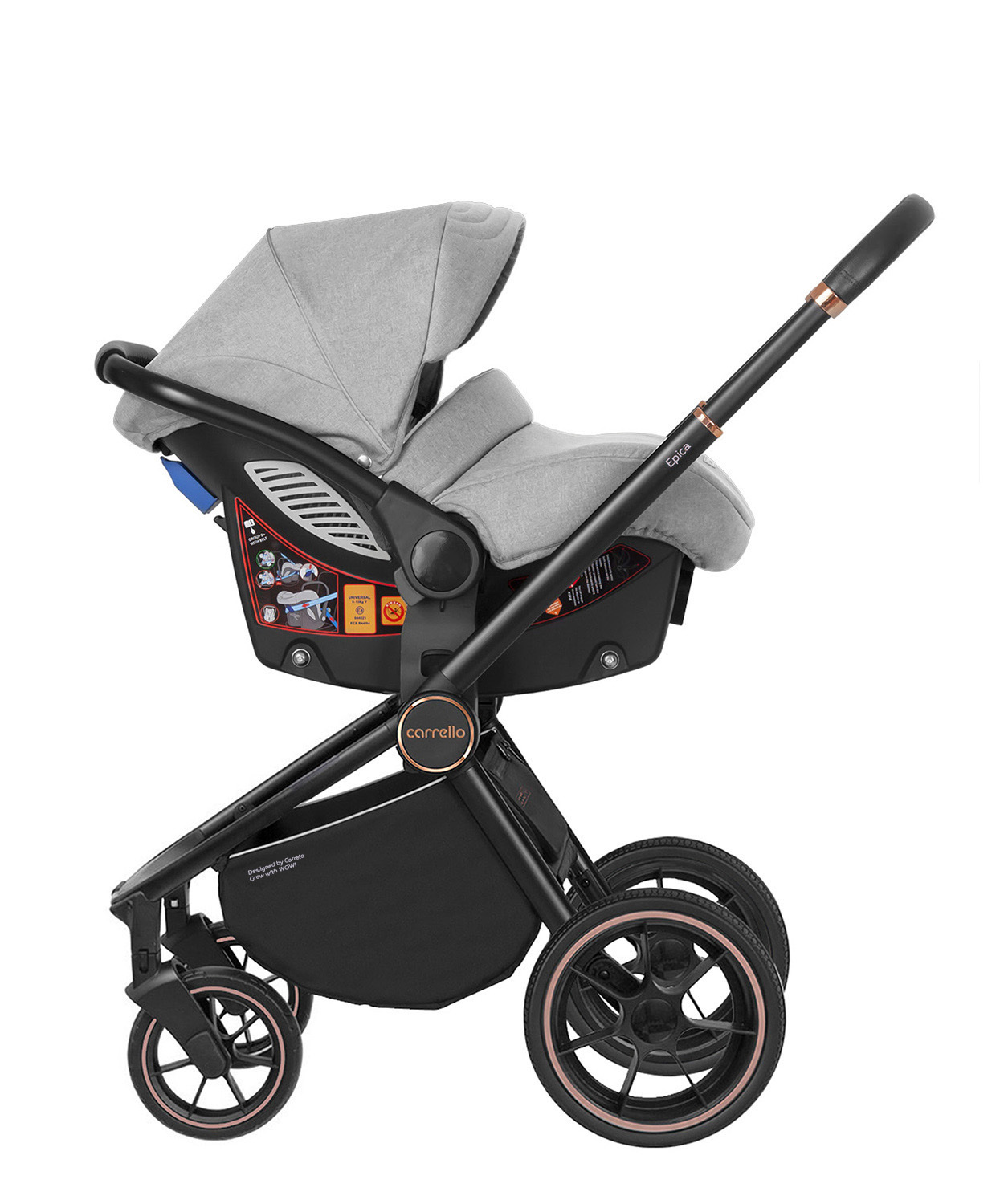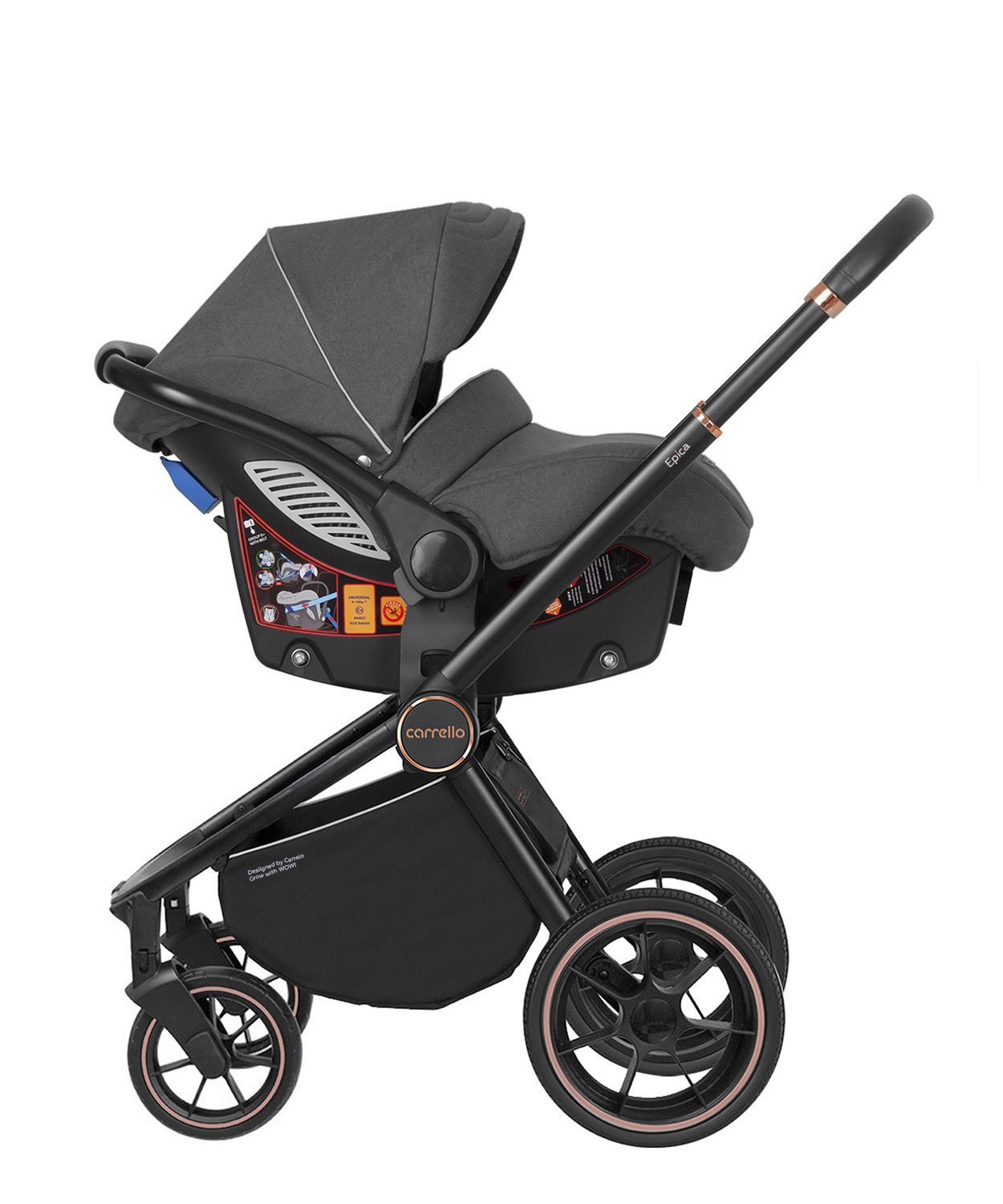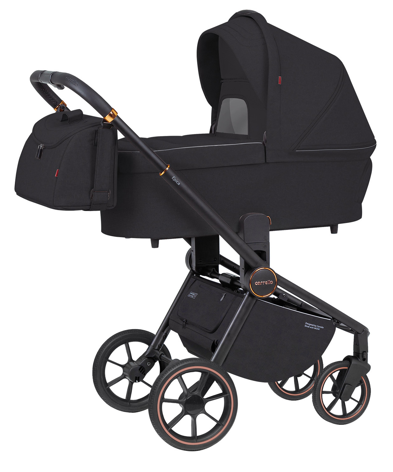Рама коляски сделана на отлично: она мало весит, компактно складывается, послушная и просто великолепно рулится! Однако мы испытали её и считаем важным предупредить, что лучше всего она больше подойдёт для городского использования. Большой выбор модных оттенков и стильная рама в чёрном цвете выделит вас среди стандартных колясок. Колёса здесь довольно большие и резиновые. Амортизация находится на задней оси сбоку, тут она адаптивная – чем больше вес малыша, тем мягче она становится. Carrello Epica комплектации 3 в 1 рассчитана на любой рост родителей: у неё телескопическая ручка, а задняя ось находится под креслом (это значит, что даже высокий папа не будет спотыкаться при быстрой ходьбе).