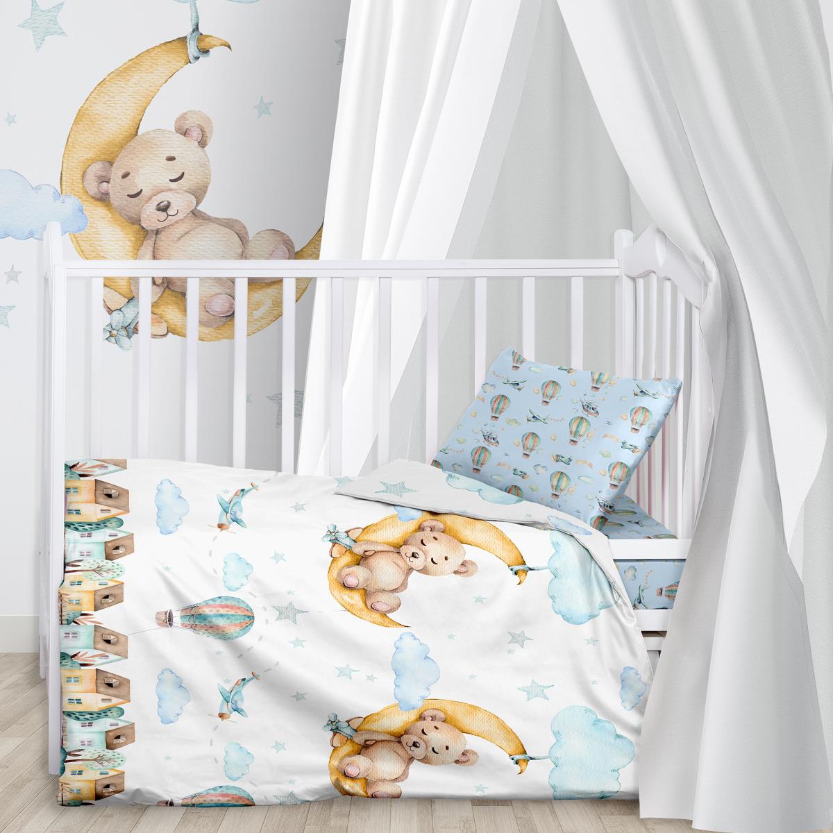 Комплект постельного белья "Лунный мишка" в детскую кроватку. Нежная цветовая гамма сочетает белые и светло-голубые тона. Рисунок из воздушных шаров и плюшевого мишки, спящего на месяце, смотрится мило и очаровывает. Комплект пошит из нежнейшего поплина (хлопок 100%), который прекрасно пропускает воздух и обеспечивает комфорт малыша во время сна.