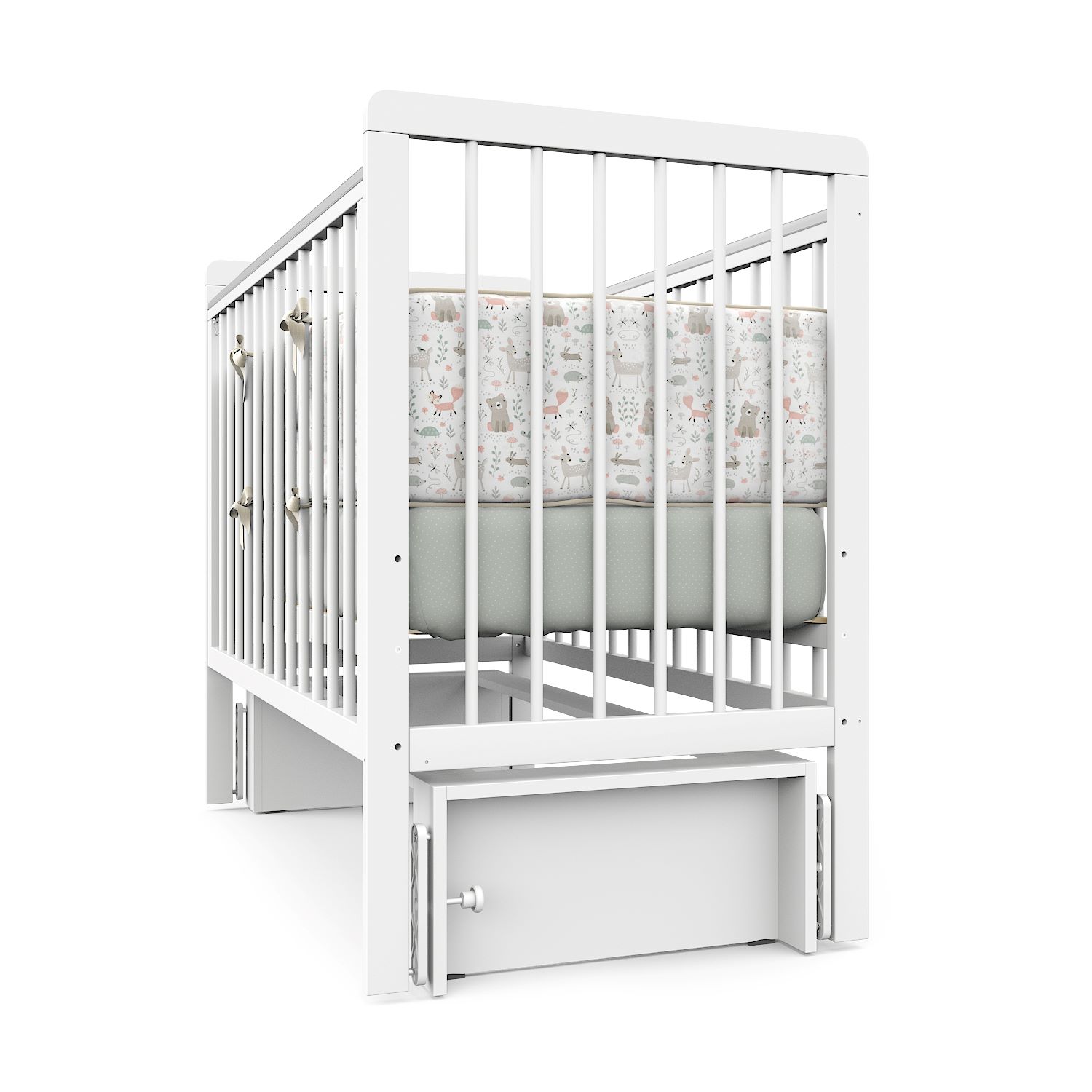 Передняя стенка опускается с шагом в 135 мм: 1 уровень – 1050 мм от уровня пола, 2 уровень – 915 мм мм от уровня пола. Также её можно убрать и использовать кроватку как приставную.