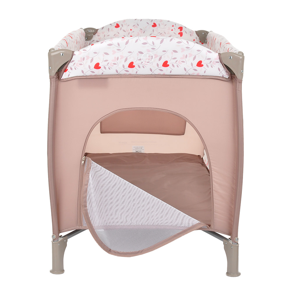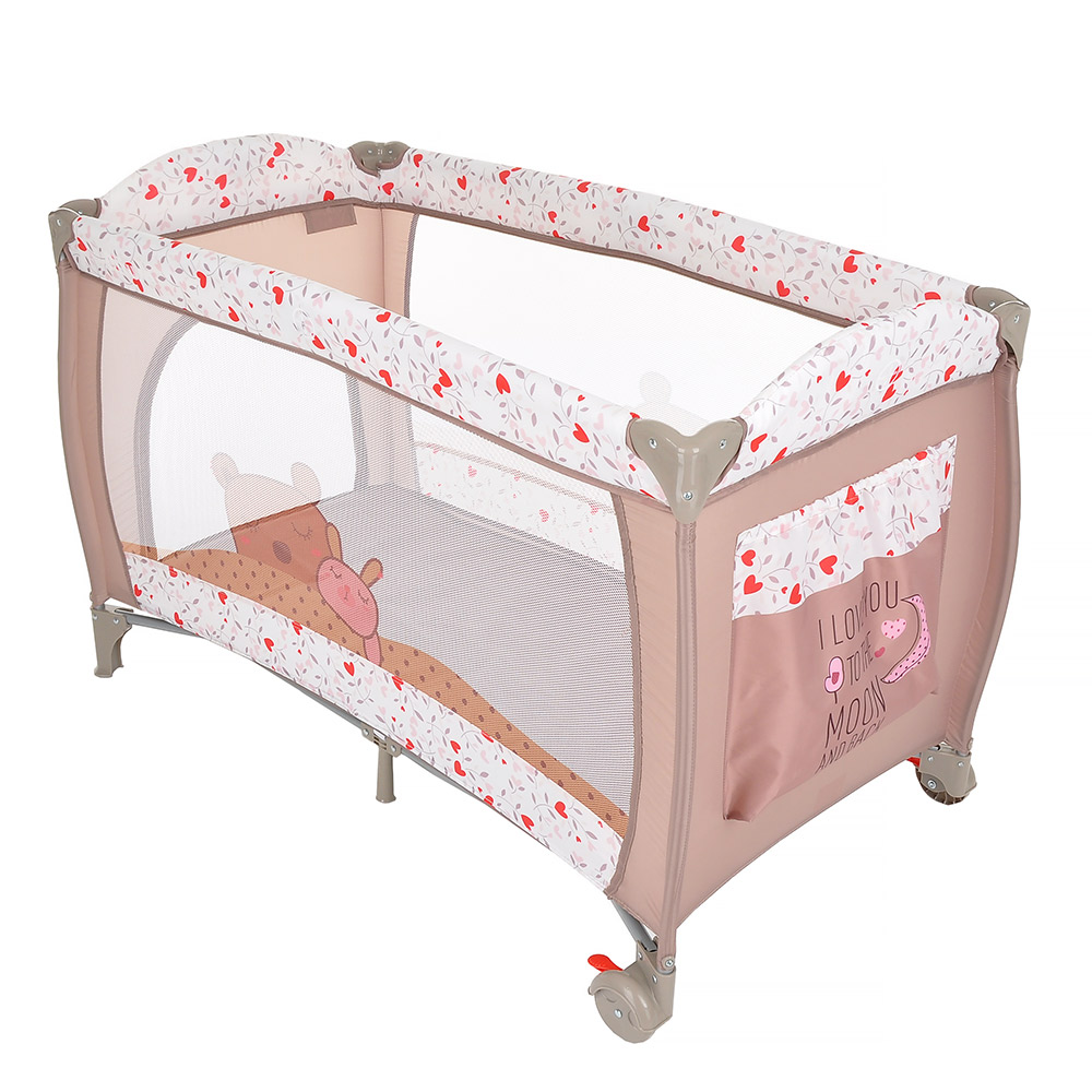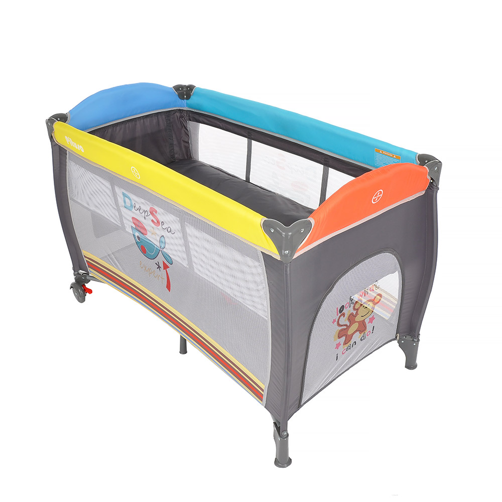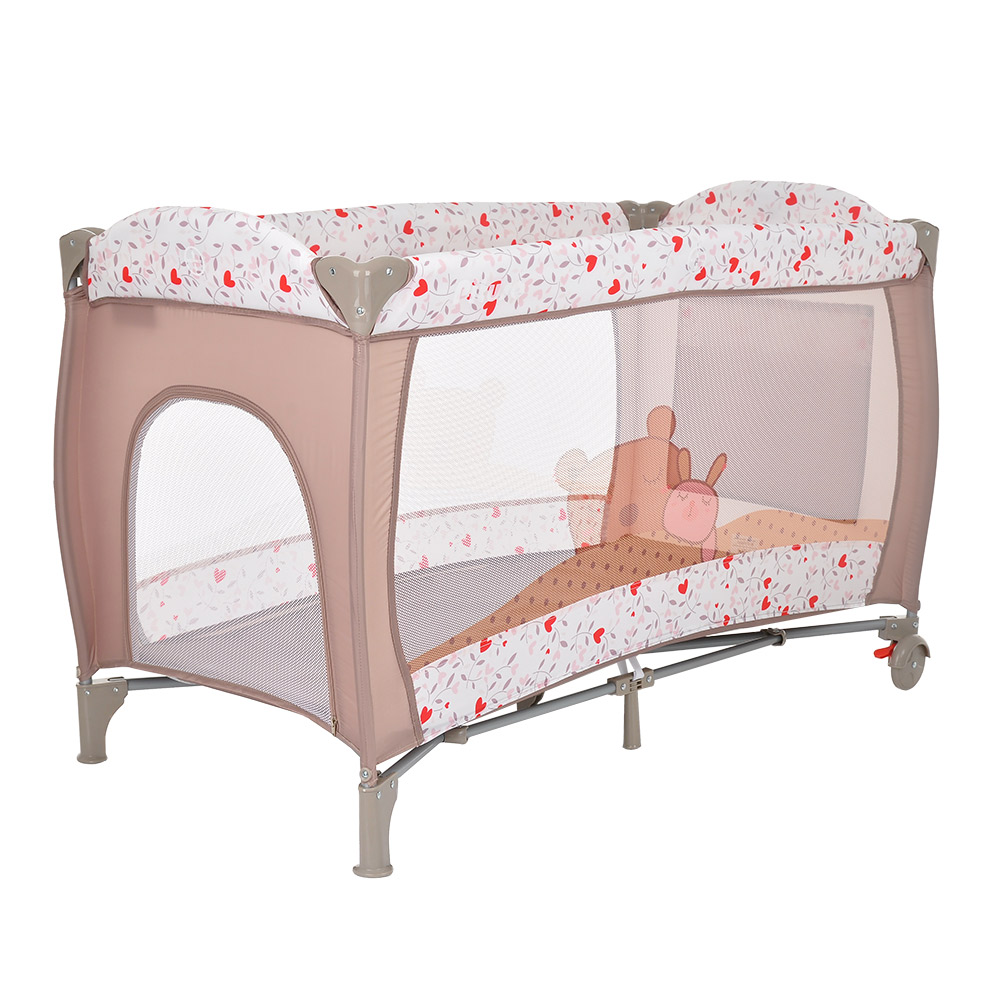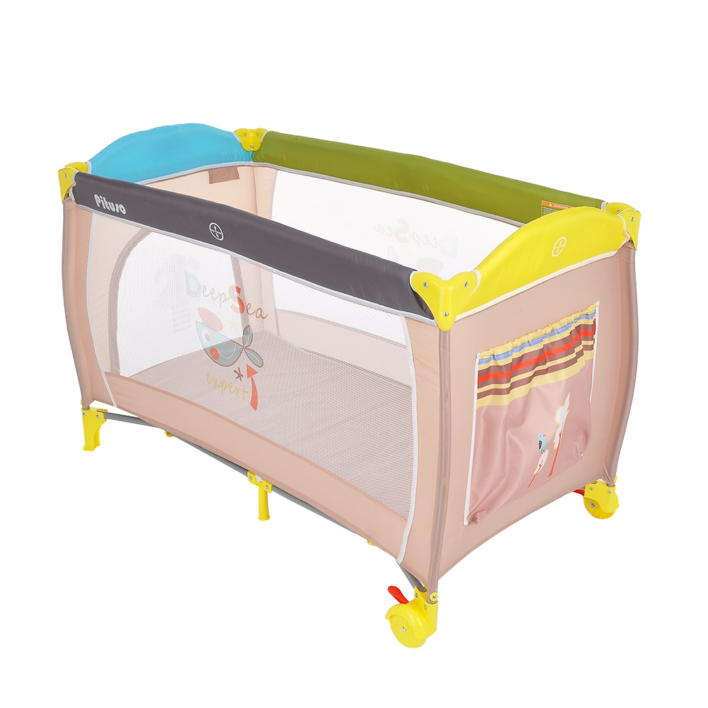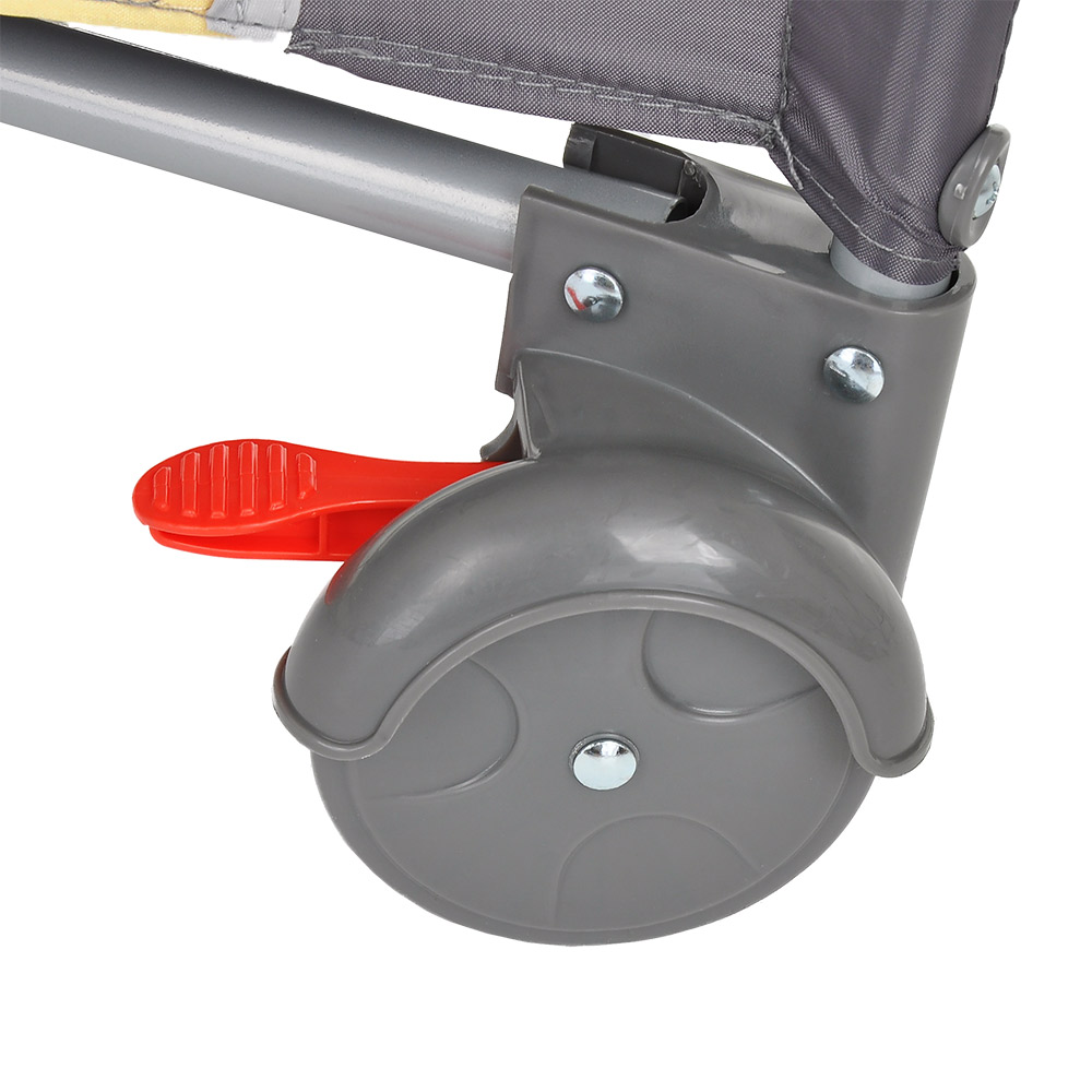 - 2 колеса с фиксаторами делают удобным перемещение манежа-кроватки по дому