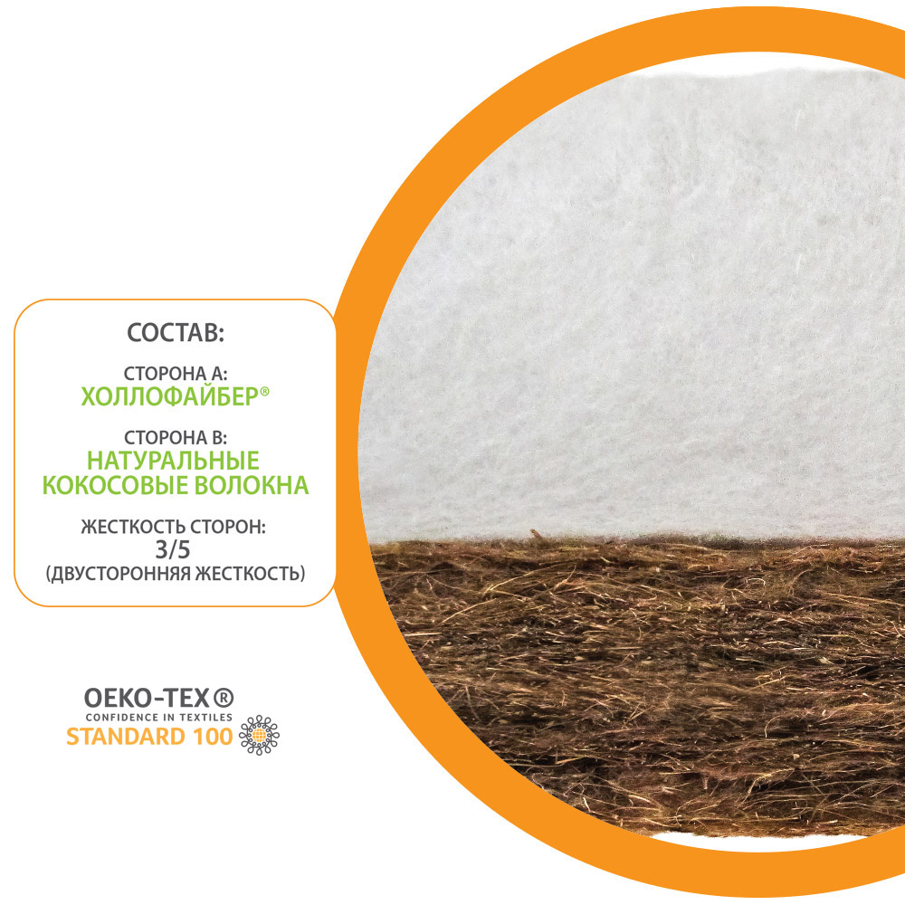 Помимо Холлофайбера имеется толстый слой из биококоса – уникального материала, получаемого при скреплении волокон натуральной кокосовой койры полиэфирными волокнами. Это гипоаллергенный материал повышенной жесткости, прекрасно пропускающий воздух и влагу, и не имеющий, а главное, не впитывающий запаха.