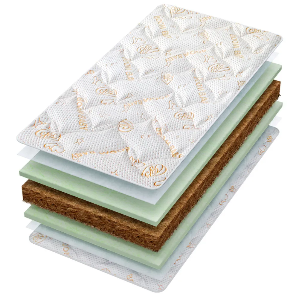 Основа матраса, изготовленная из натуральной кокосовой койры создает каркас ортопедического эффекта. Этот материал обладает высокими показателями жесткости, что способствует правильному формированию осанки и мышечного корсета малыша. Кокосовая койра прекрасно пропускает воздух, экологична и долговечна. С двух сторон матраса расположен двойной слой эвкалиптовых волокон. Для достижения упругой, износостойкой поверхности нежных эвкалиптовых волокон, при производстве используется специальная методика, в которой натуральные волокна эвкалипта соединяются с инновационными волокнами Hollcon.