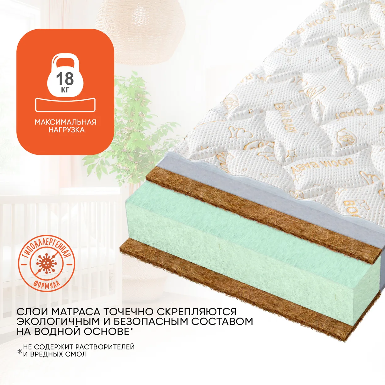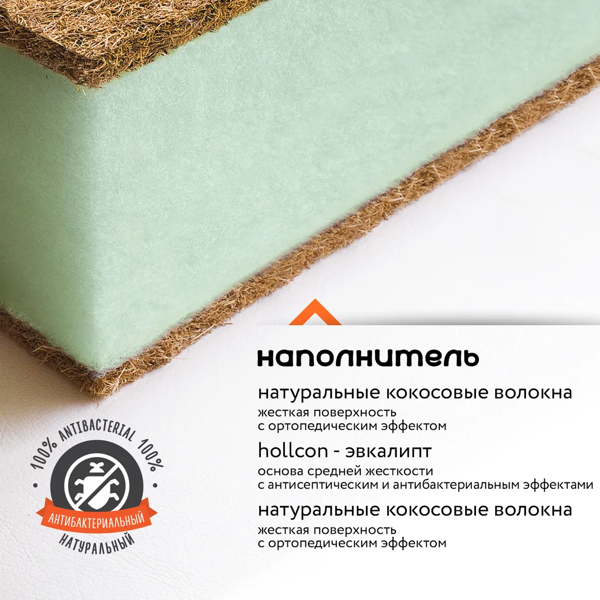 Жесткая поверхность матраса из кокосовых волокон предназначена для сна новорожденного младенца, ведь кокос признан специалистами-ортопедами как один из самых оптимально-жестких наполнителей. Кокосовая койра образует упругий, и в то же время очень эластичный материал, с прекрасной воздухопроницаемостью, а слой кокосовых волокон с двух сторон значительно повышает ортопедические свойства матраса.