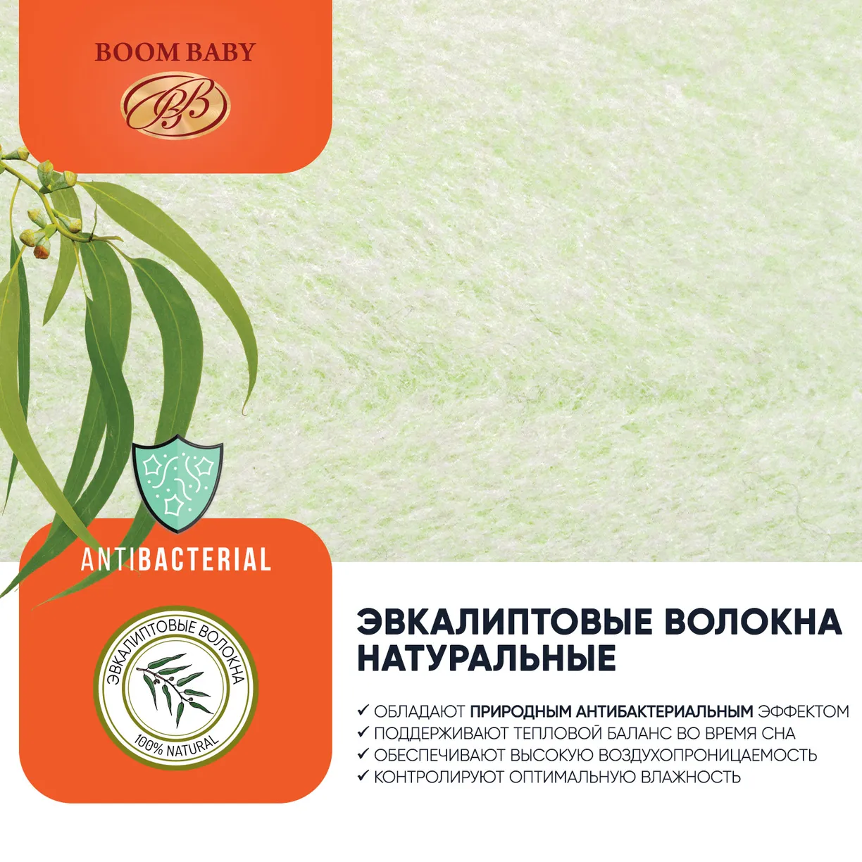 Волокна эвкалипта — прочные и долговечные, и, самое главное, гипоаллергенные. Наполнители с такими волокнами известны своей прекрасной впитывающей способностью, отличаются воздухопроницаемостью, за счет чего в кроватке создается оптимальный тепловой баланс. Для достижения упругой, износостойкой поверхности при производстве используется специальная методика, в которой натуральные волокна эвкалипта соединяются с инновационными волокнами Hollcon.
