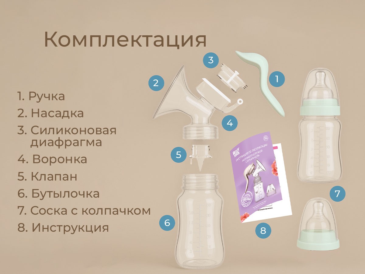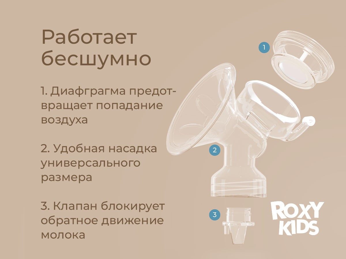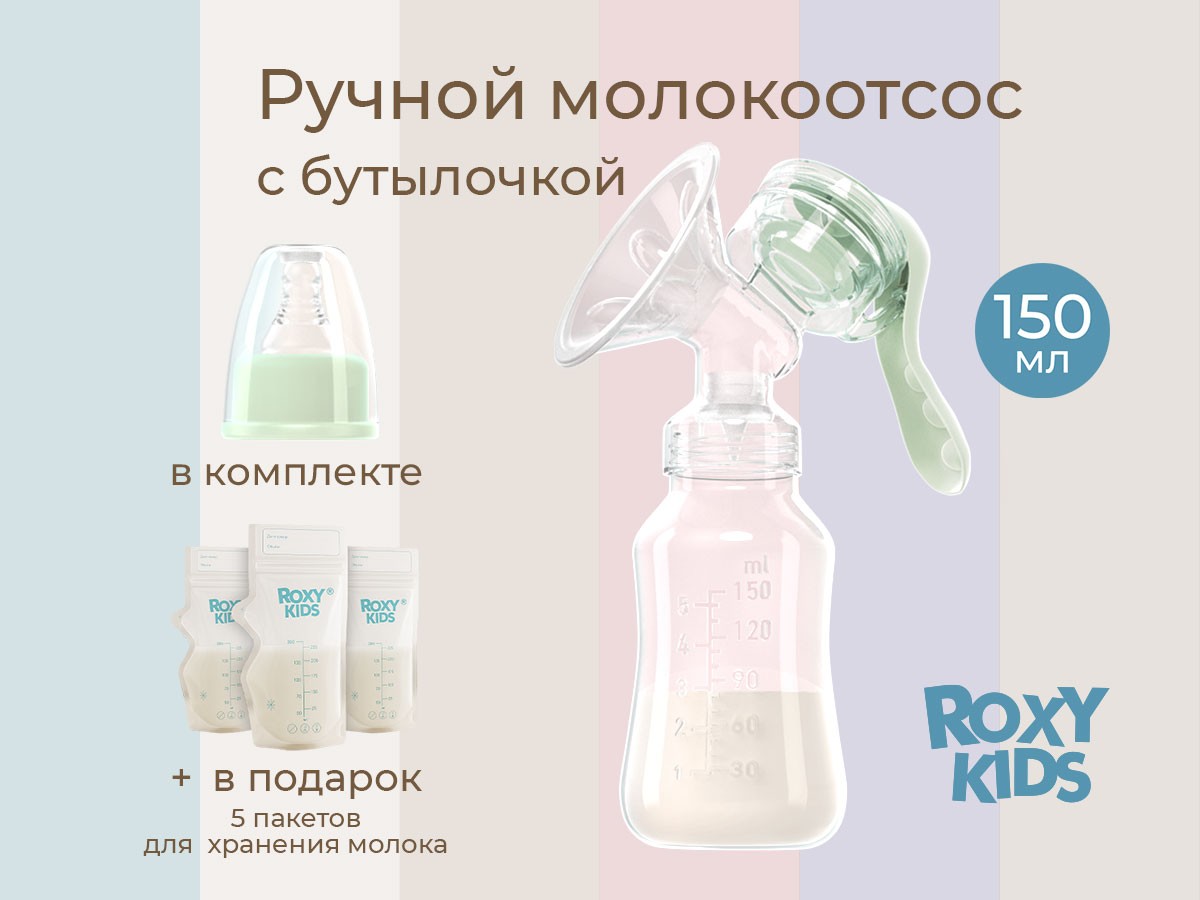 Ручной молокоотсос с бутылочкой от ROXY-KIDS – незаменимый помощник каждой кормящей мамы, обеспечивающий комфортное и эффективное сцеживание грудного молока. Компактный размер и легкий вес делают его идеальным для использования дома, в дороге или в путешествии. Мягкая силиконовая накладка деликатно прилегает к груди, обеспечивая бережное и безболезненное сцеживание. Молокоотсос работает абсолютно бесшумно, позволяя сцеживать молоко в любое время и в любом месте, не беспокоя малыша. Бутылочка емкостью 150 мл оснащена четкой выпуклой мерной шкалой для удобного контроля количества сцеженного молока. Молокоотсос легко разбирается и моется. В комплект входят соска, кольцо и колпачок, которые превращают емкость для сцеживания в полноценную бутылочку для кормления. В подарок идет 5 пакетов для удобного хранения и заморозки грудного молока. Простой механизм позволяет быстро освоить технику сцеживания, поэтому молокоотсос станет надежным спутником на протяжении всего периода грудного вскармливания. Наслаждайтесь материнством с ROXY-KIDS!