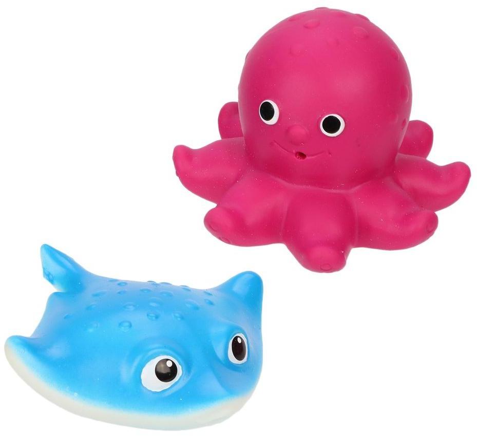 Яркие игрушки не оставят равнодушным ни одного малыша - теперь купание будет только в радость! В набор входит: осьминог, скат. Размер: 5,6 – 2,9 см. Все фигурки плавают – хорошо держатся на поверхности воды. Можно использовать их и как брызгалки, для этого их нужно сжать игрушку и опустить под воду, внутрь наберется вода, которая при нажатии будет вылетать из отверстия.