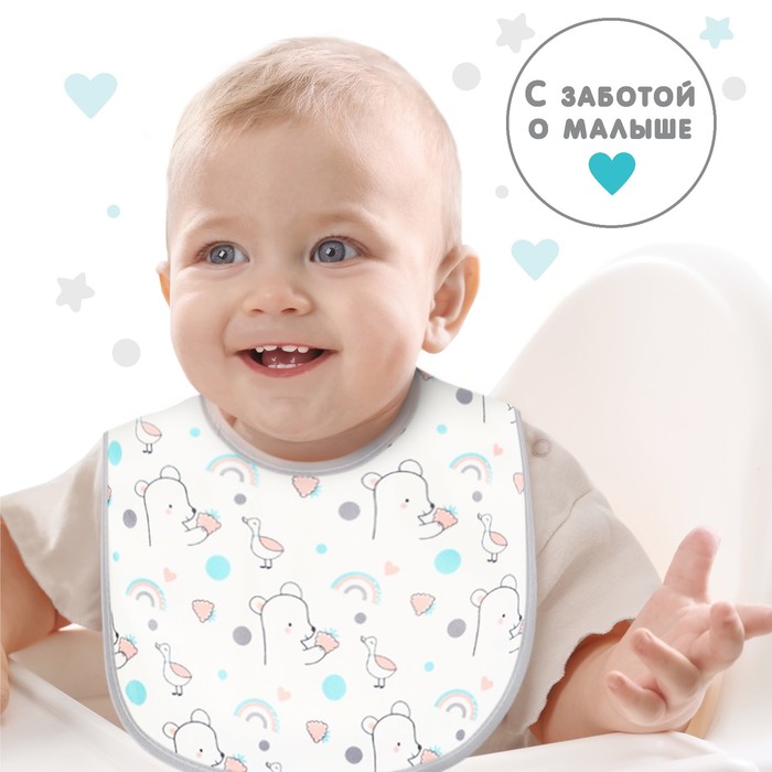 Непромокаемый нагрудник подходит для крошек, которые учатся кушать самостоятельно. Одежда останется сухой и чистой, а сам малыш сохранит опрятный и аккуратный вид после приёма пищи.