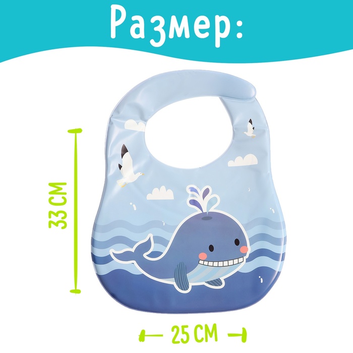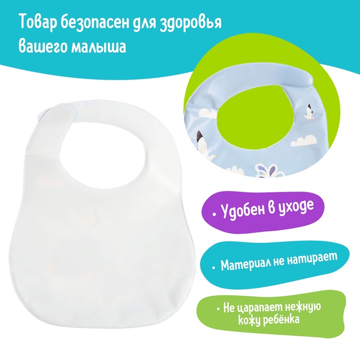 Нагрудник надёжно защищает одежду ребёнка от пятен, сохраняя её чистой и сухой. Его легко брать с собой в поездки, прогулки или кафе, благодаря компактности и простоте ухода. Материал позволяет протирать нагрудник влажной салфеткой или мыть под краном.