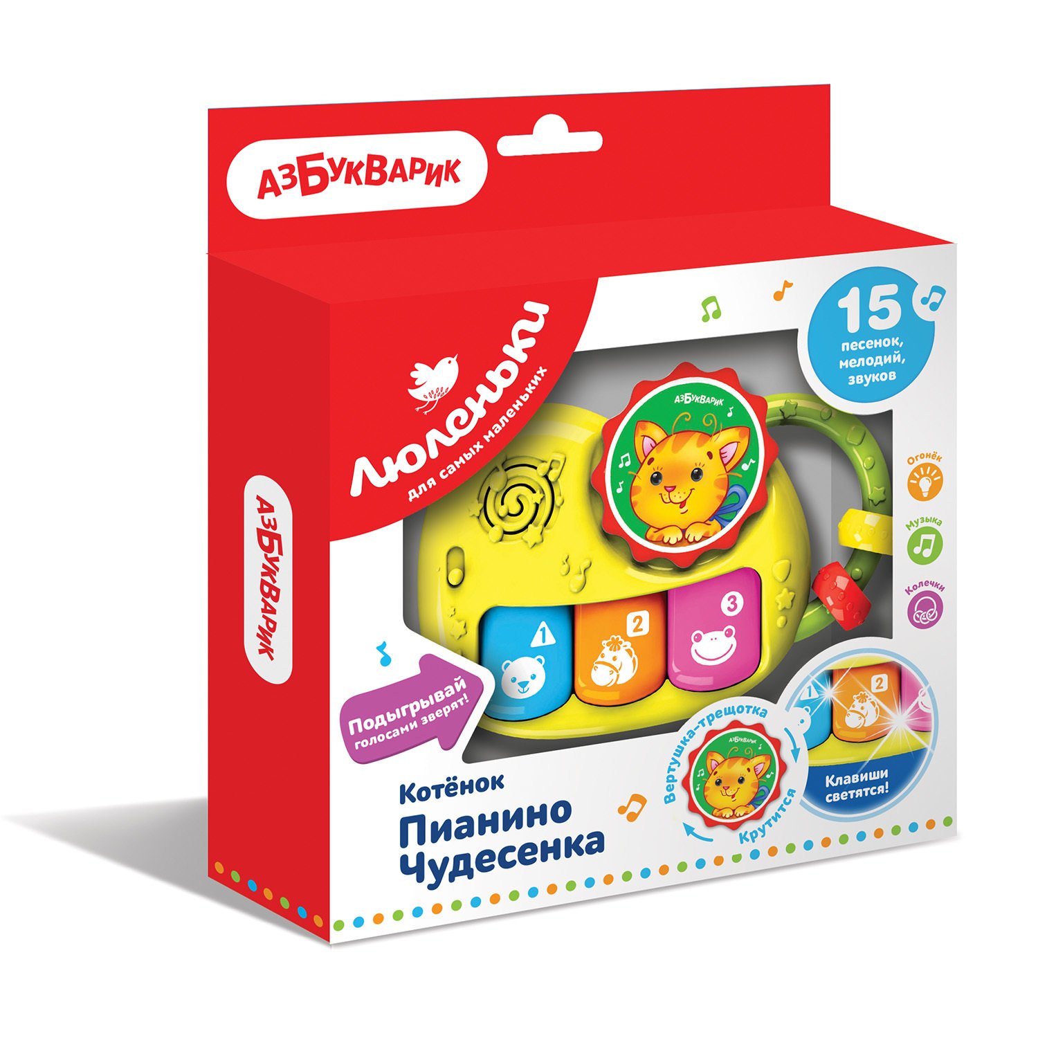 Миниатюрная игрушка-пианино разработана специально для малышей. Нажимая на яркие клавиши ребенок послушает 6 милых песенок о зверятах. Переключите режим — и на клавишах зазвучат веселые мелодии. Под них кроха сможет сам подыграть голосами зверят и смешными звуками. Эта игра не только развлекает, но и развивает у ребенка воображение и музыкальные способности. Во время звучания песенок и мелодий клавиши светятся. Также малышу понравится крутить колесико с забавной зверюшкой и слушать звук трещотки. А яркие колечки и рельефные элементы игрушки так приятно трогать детскими пальчиками! Пианино удобно носить с собой.