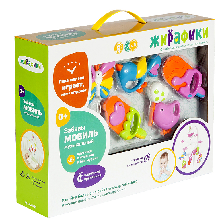 Мобиль - это одна из первых игрушек для новорождённых и уникальный тренажер для развития визуального восприятия и слуховых ощущений. Забавные зверюшки, прикрепленные к мобилю, поворачиваются по кругу, как карусели. Пытаясь следить за ними глазами, малыш учится фокусировать взгляд на объекте. Игрушки можно снимать и давать играть с ними ребенку отдельно. Изделие работает в двух режимах: "кручение с музыкой" и "кручение без музыки".