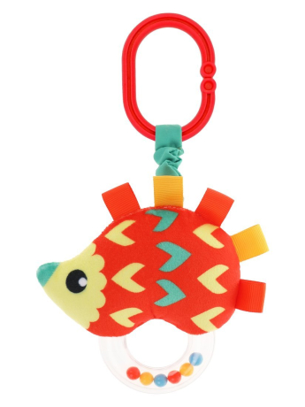 Погремушка в виде ежика изготовлена из приятных на ощупь текстильных материалов, с наполнителем из полиэфирных волокон, элементами из полимерных материалов.