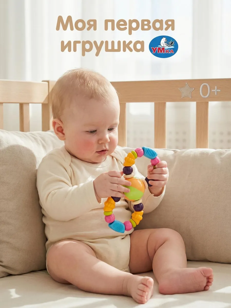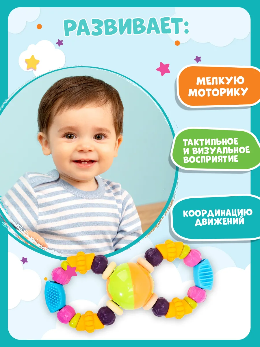 Развивающая игрушка Восьмёрка включает всё, что нужно для полноценного развития малыша. Яркие цвета и звуки трещотки пробудят интерес ребёнка к окружающему миру.