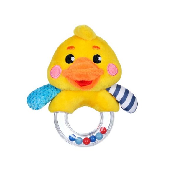 Разноцветные шарики внутри пластмассового колечка весело подпрыгивают и забавно гремят, если хорошенько потрясти игрушкой в воздухе. Утенок сшит из очень приятных на ощупь разноцветных тканей: гладких, ворсистых и вязаных.