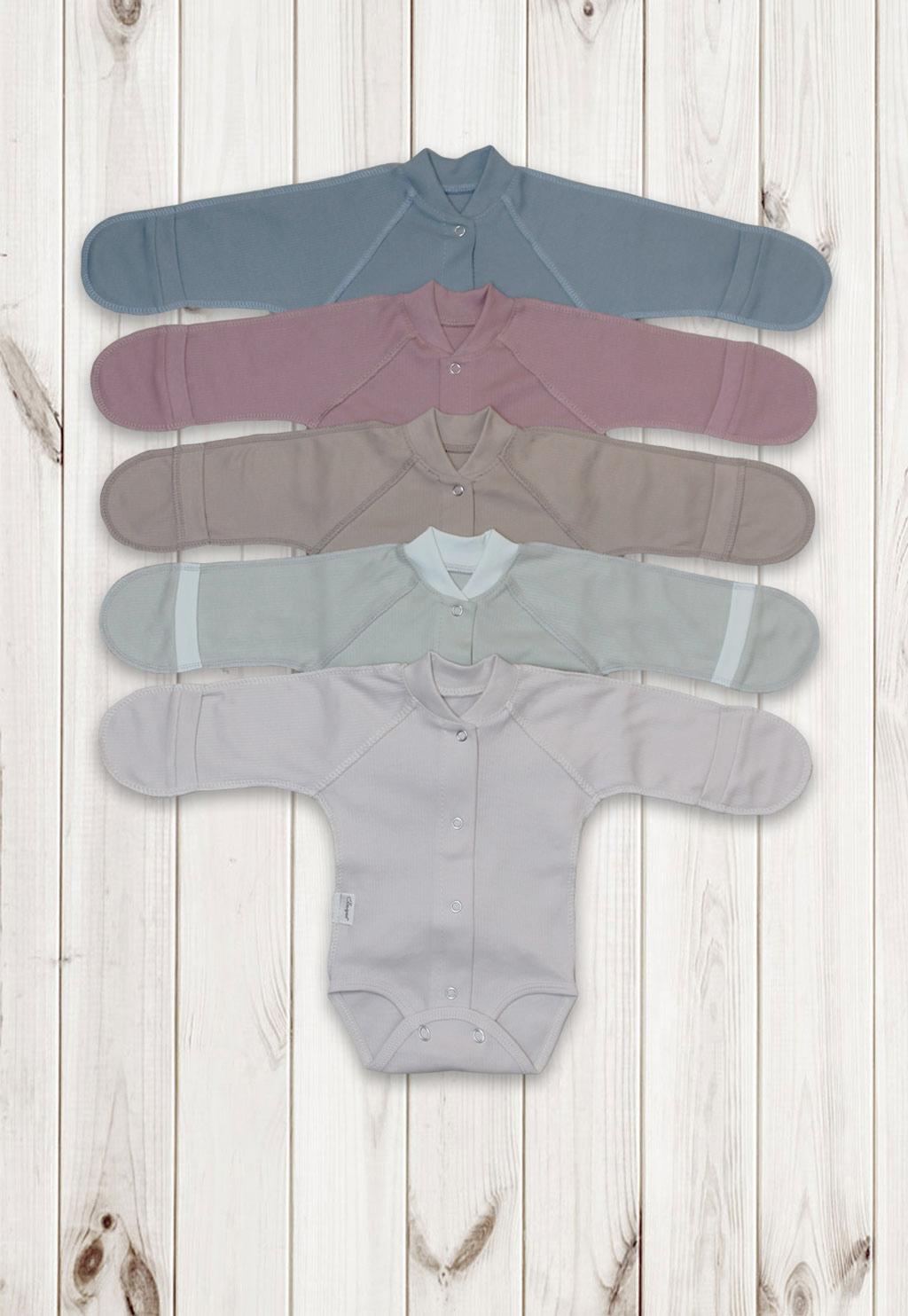 Воротник круглый, рукава длинные, ручки закрытые. Ножки открытые, застежка на кнопка впереди и снизу.