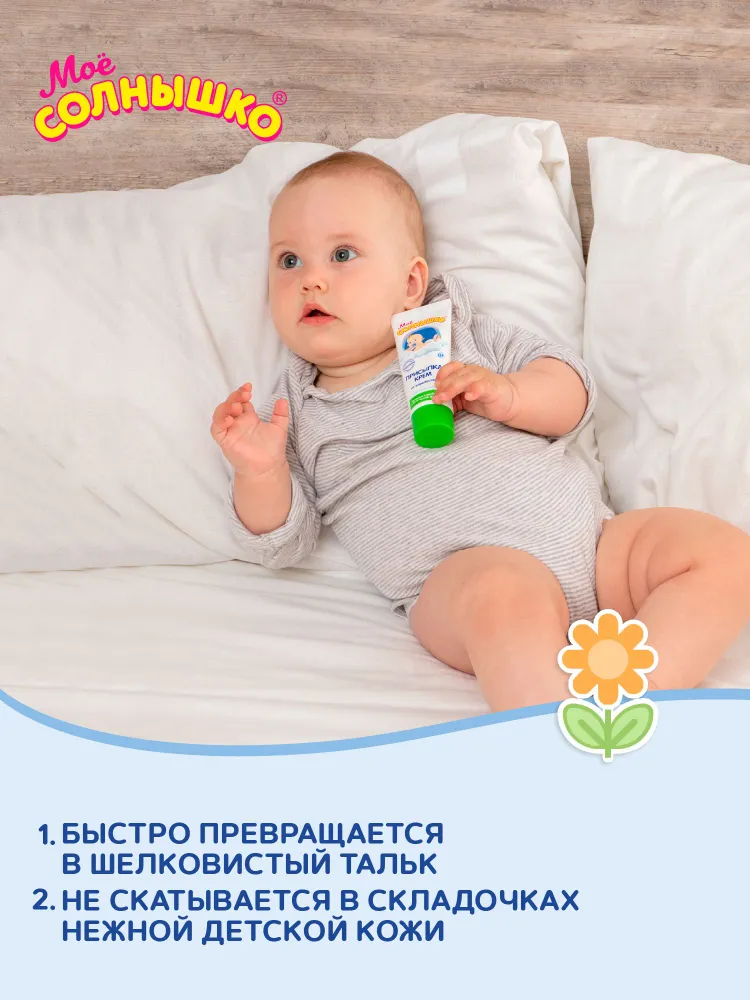 Детская присыпка-крем - безопасная удобная форма: равномерно распределяется, не скатывается валиками в складочках нежной детской кожи.