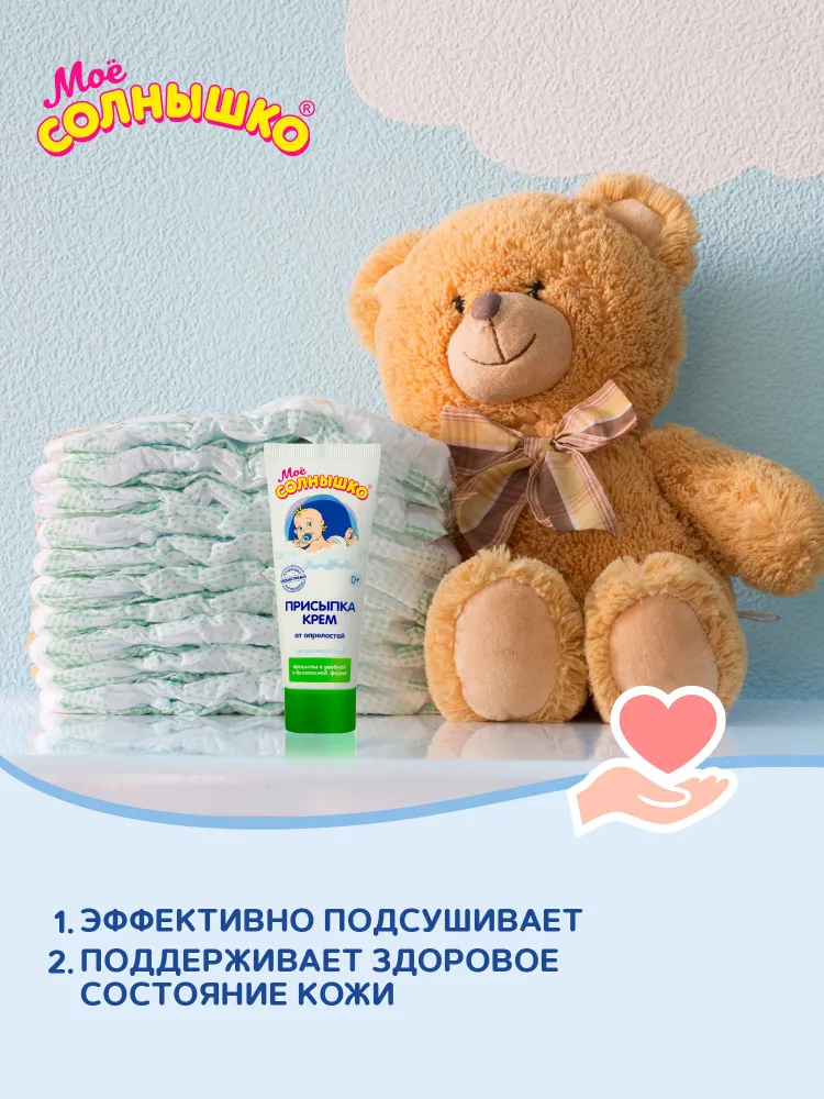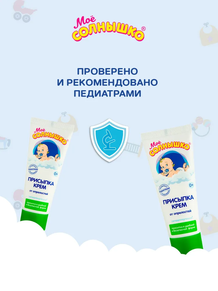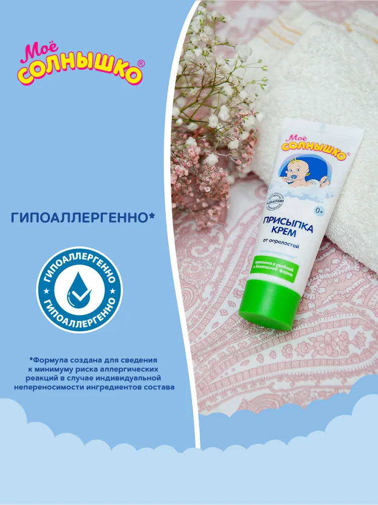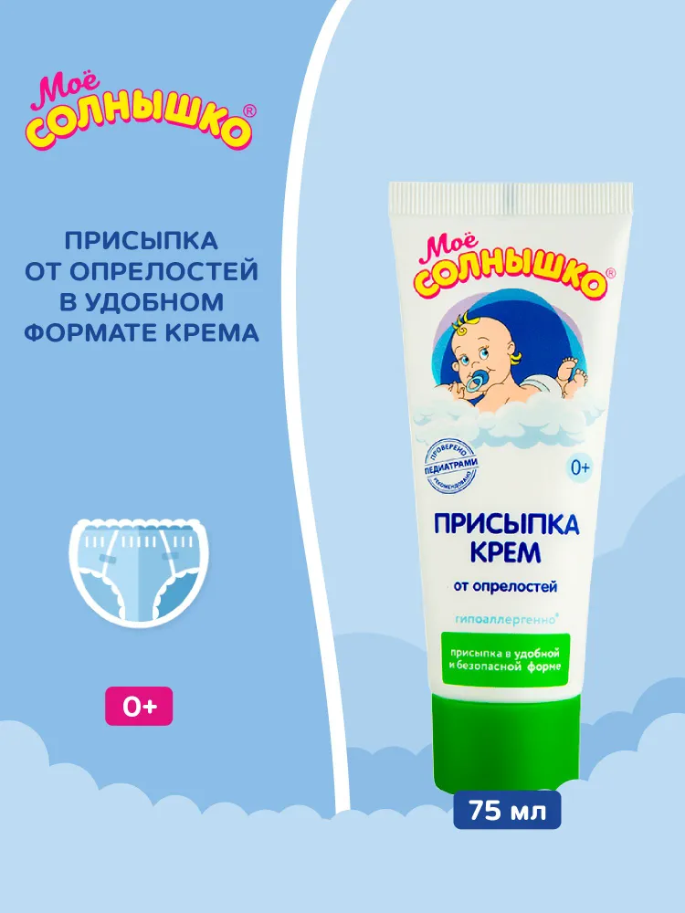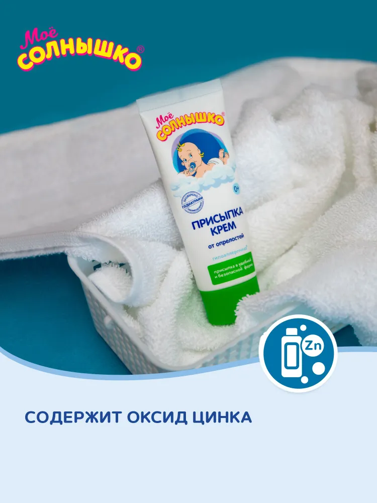Присыпка-крем Моё солнышко® универсальна – она мягко подсушивает опрелости, которые могут появиться у малыша в складочках на шее, на теле, на ручках и ножках в следствие потоотделения, повышенной влажности, механического воздействия (например, от шва распашонки), несвоевременной гигиены, использования «не детских» косметических средств. Её используют также для профилактики возникновения опрелостей на теле в жаркую погоду.