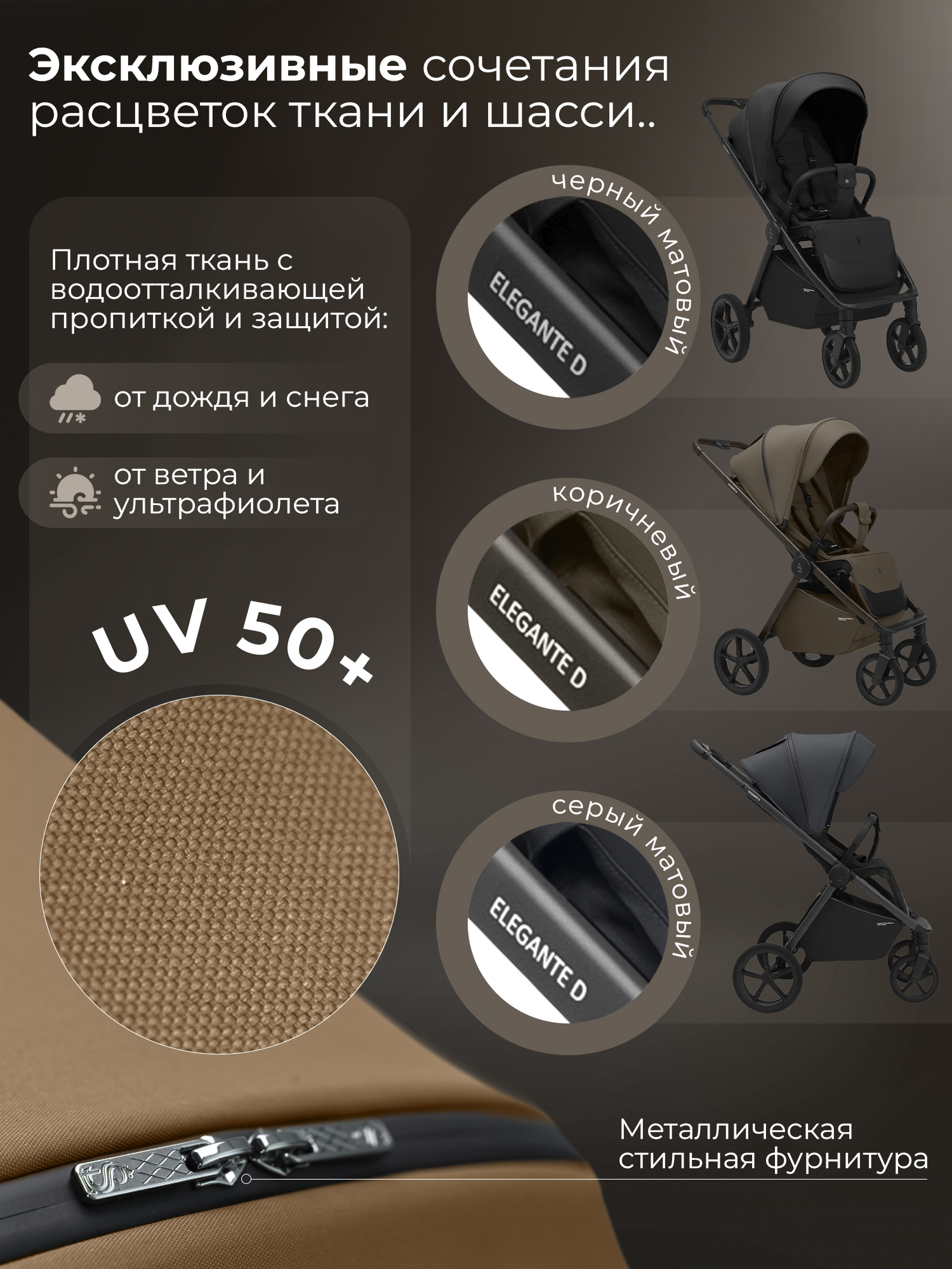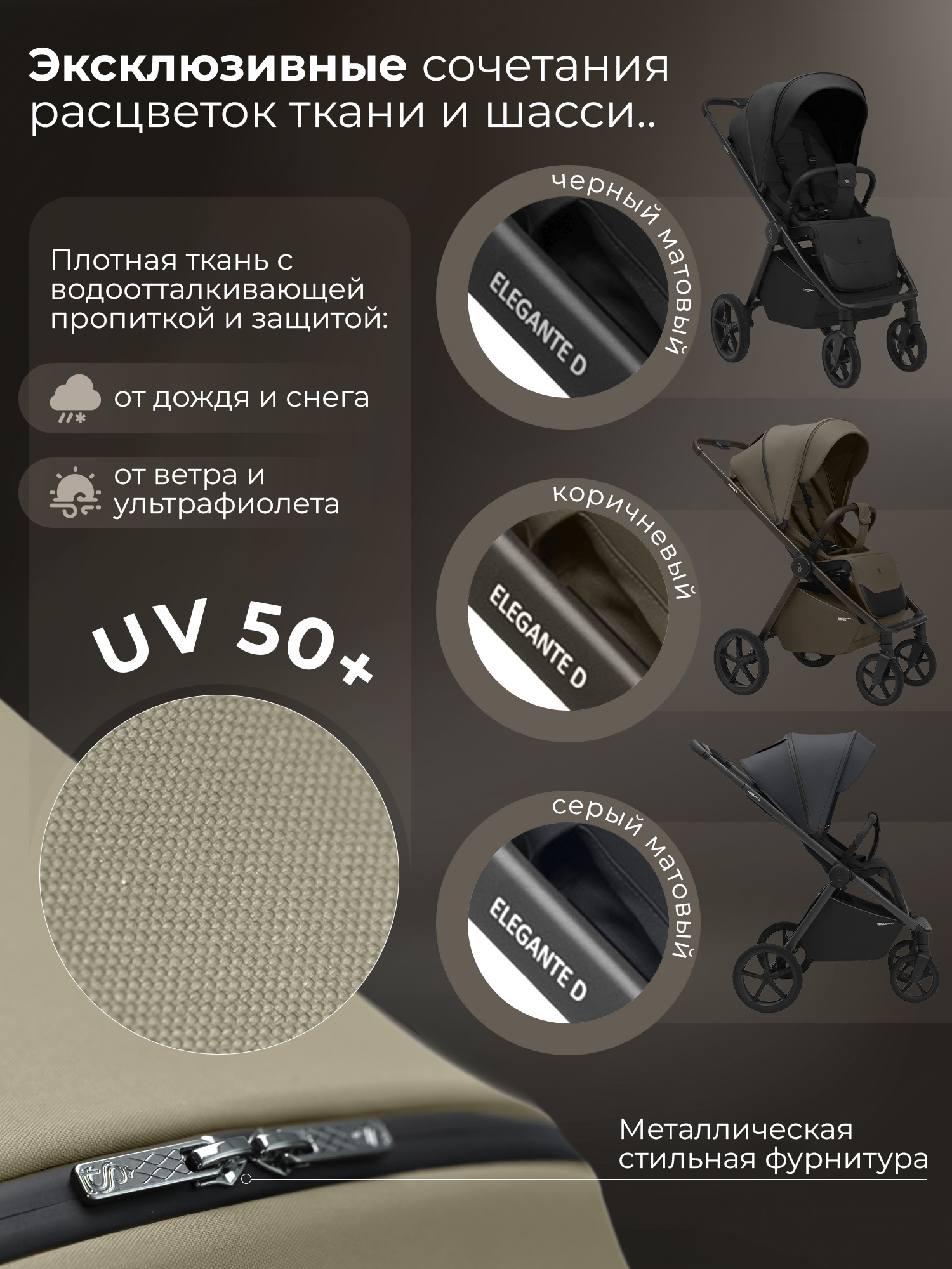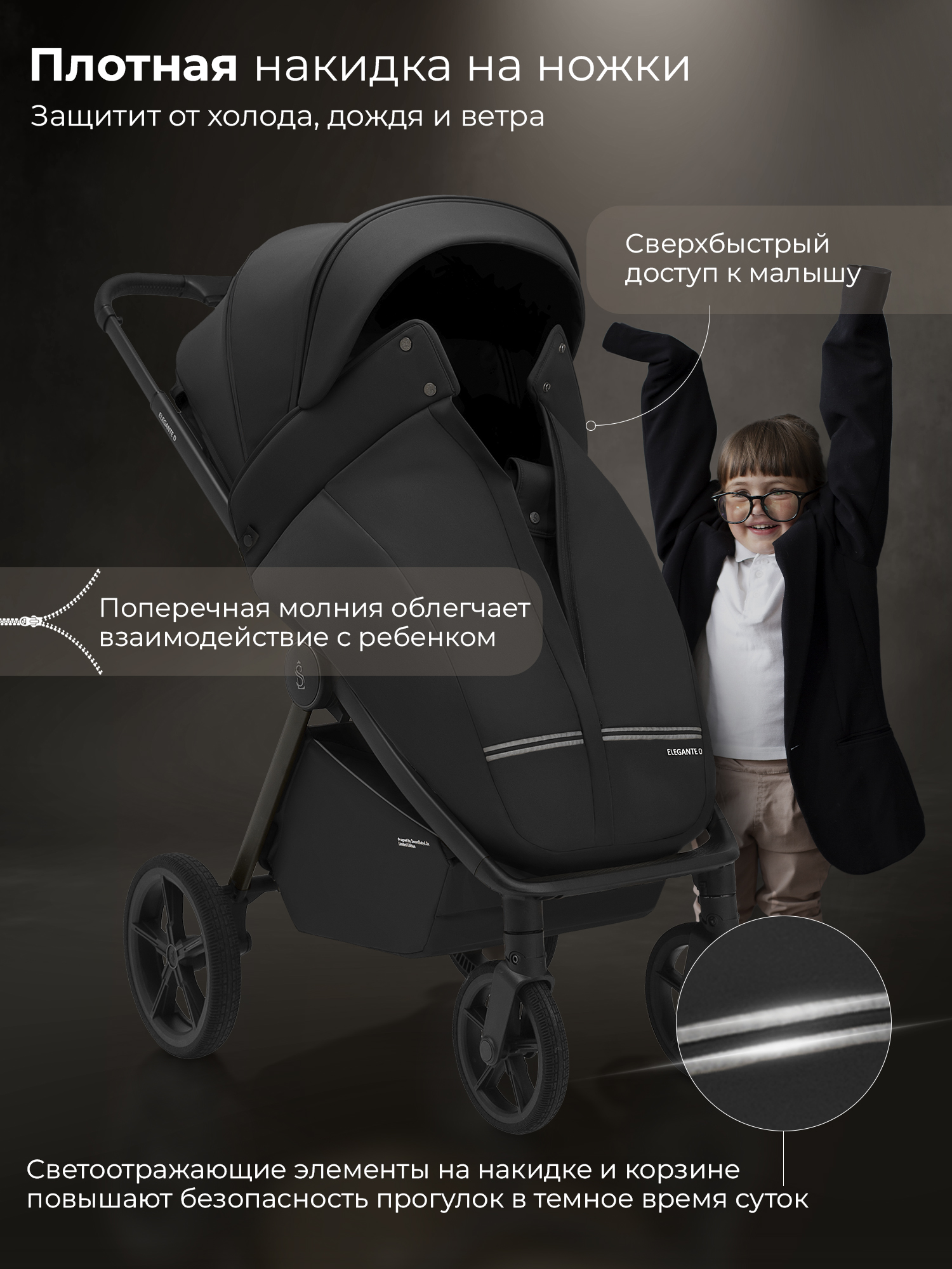Водоотталкивающая ткань капора защищает от ультрафиолетовых лучей и непогоды, а накидка на ножки - распашонка с легким доступом к ребенку – от ветра и холода;