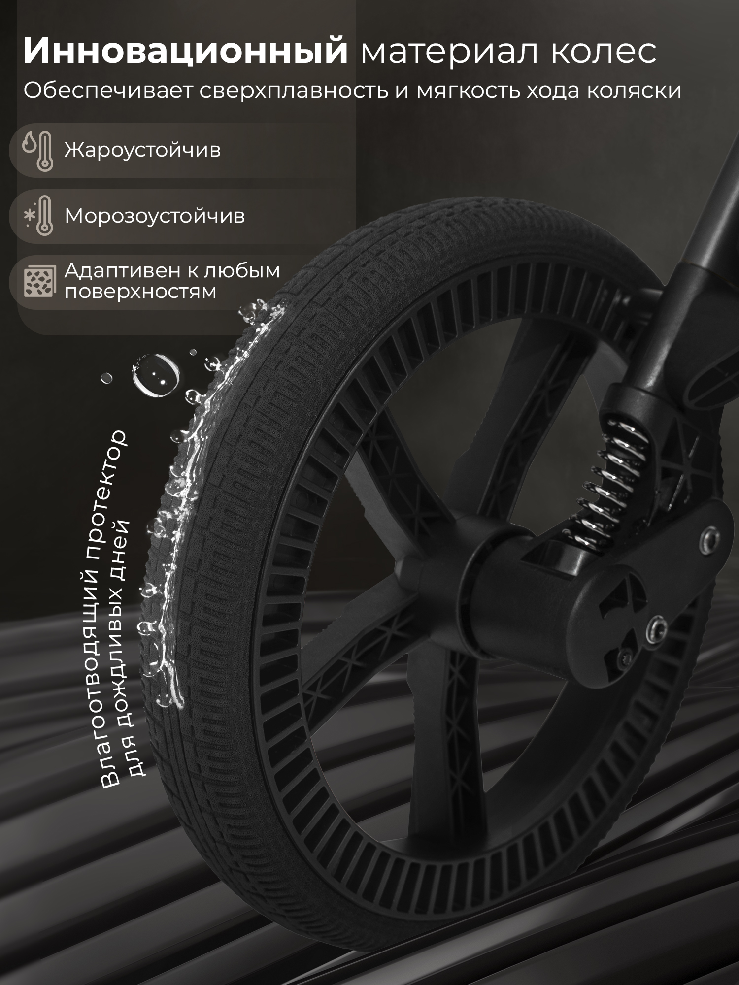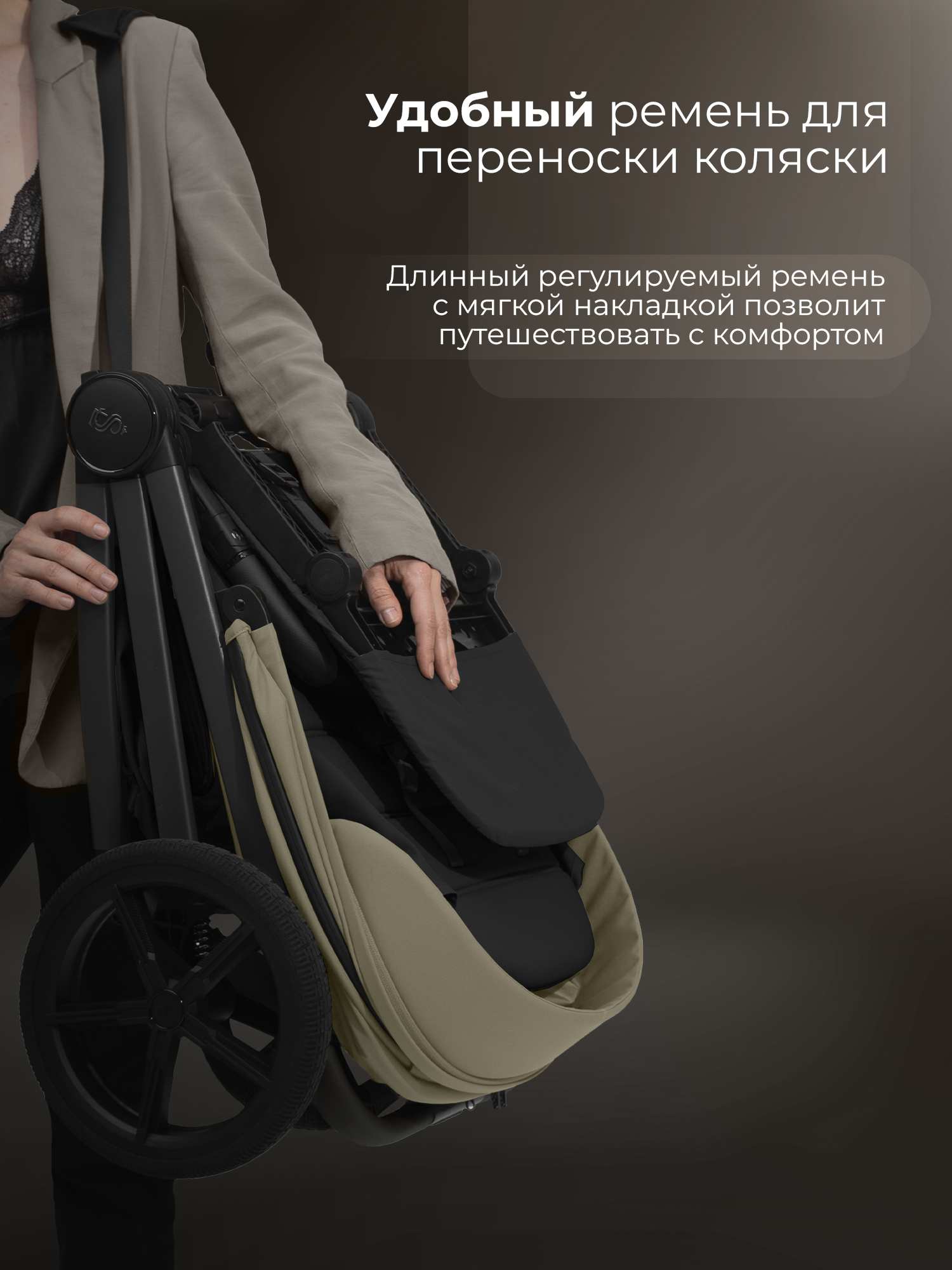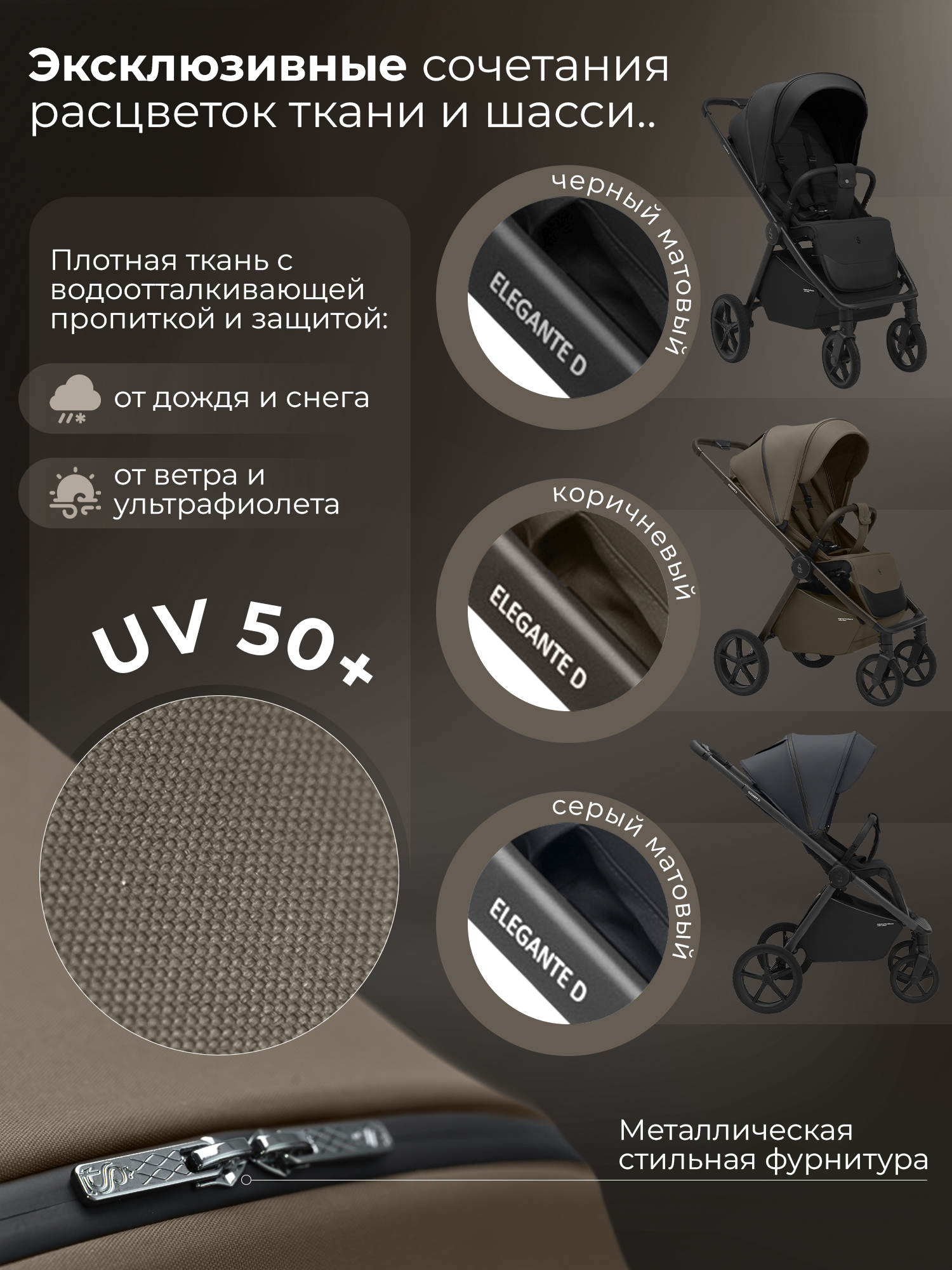 Водоотталкивающая ткань капора защищает от ультрафиолетовых лучей и непогоды, а накидка на ножки - распашонка с легким доступом к ребенку – от ветра и холода;
