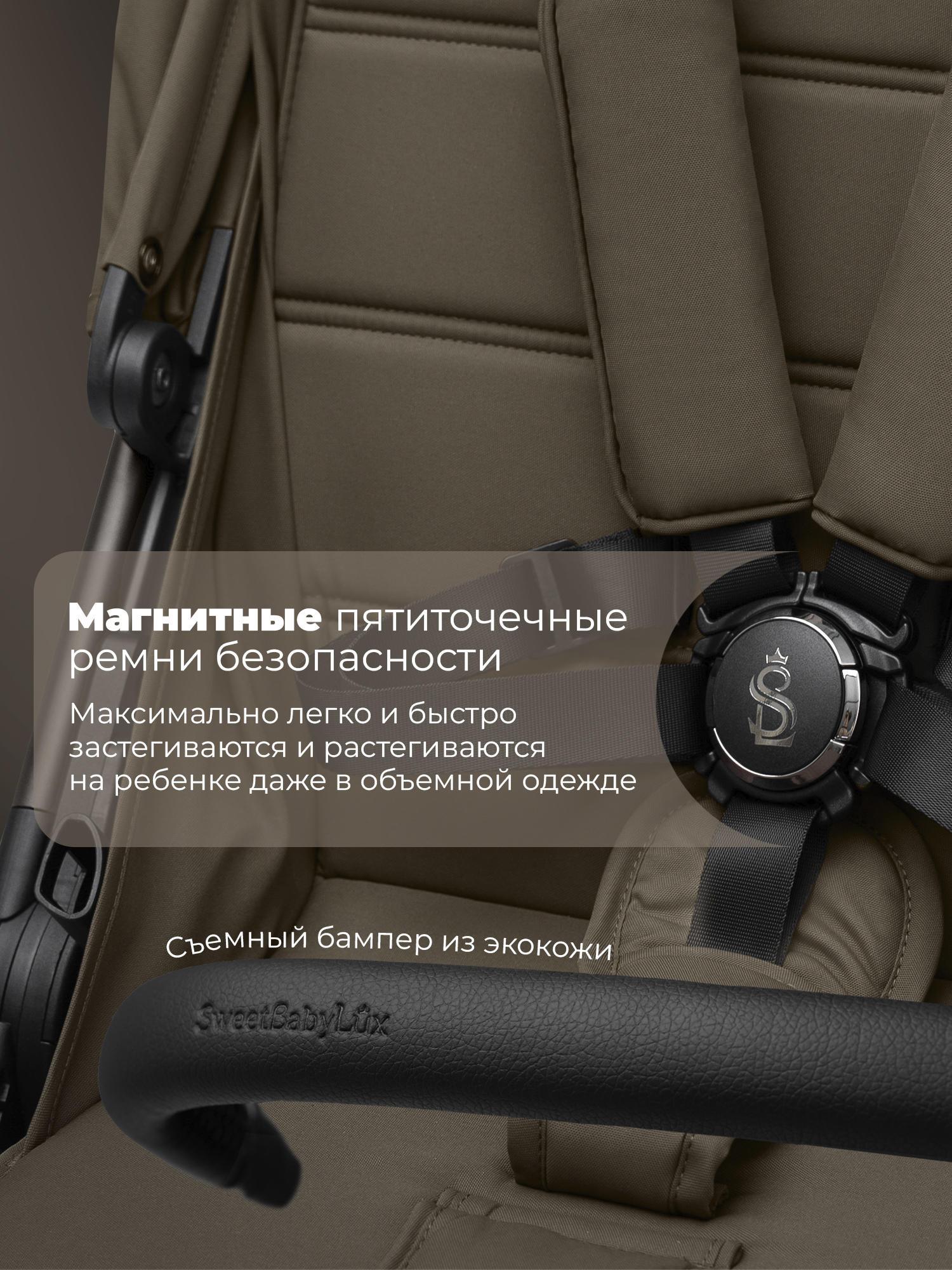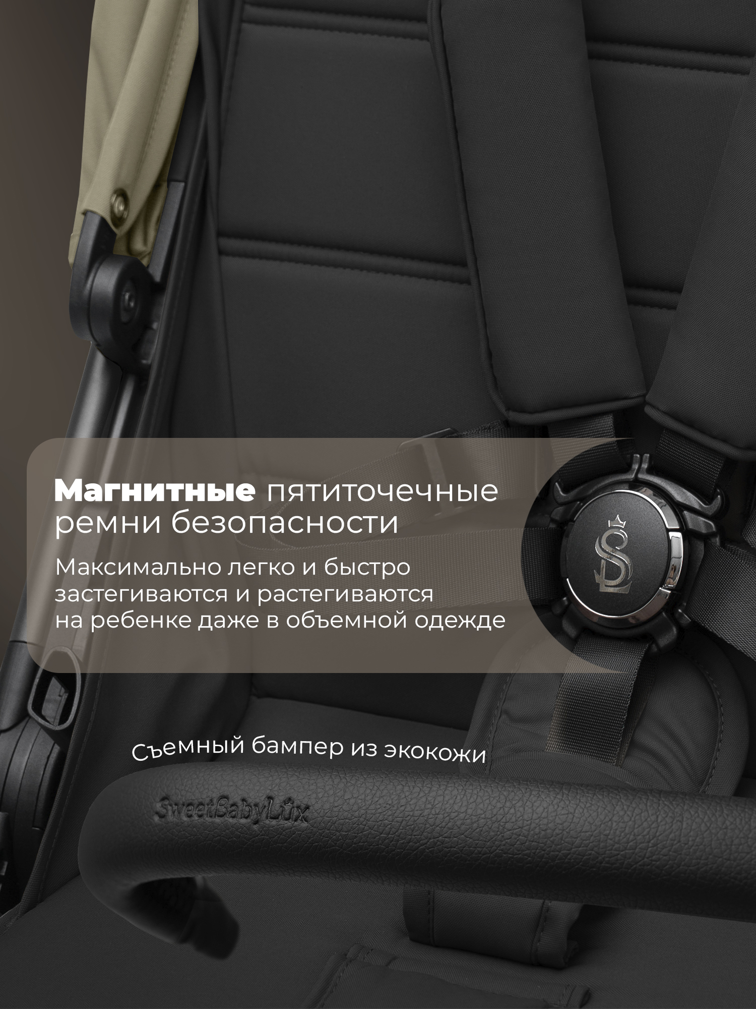 Пятиточечные магнитные ремни с мягкими накладками и съемный поворотный бампер для быстрой и легкой посадки;