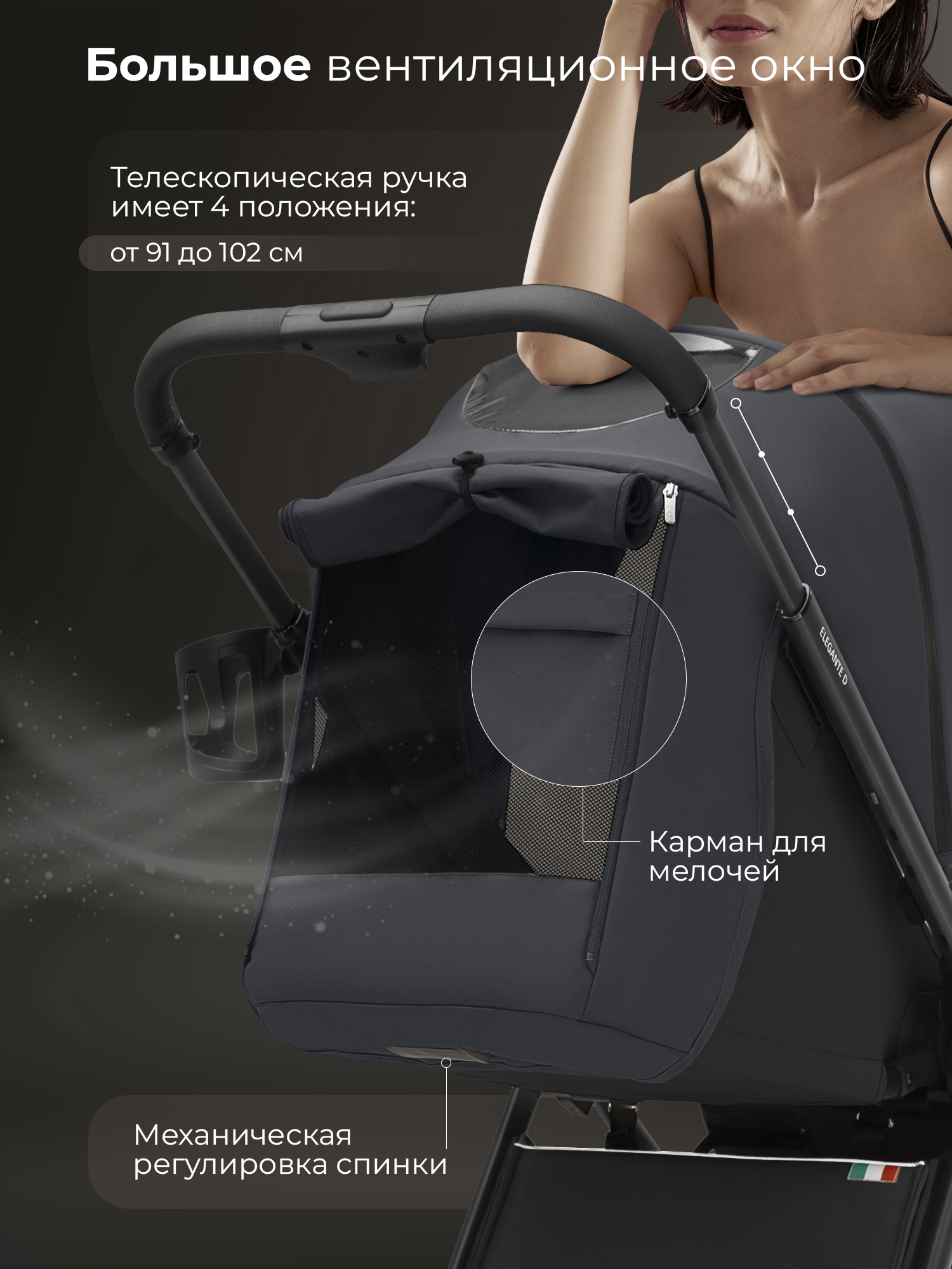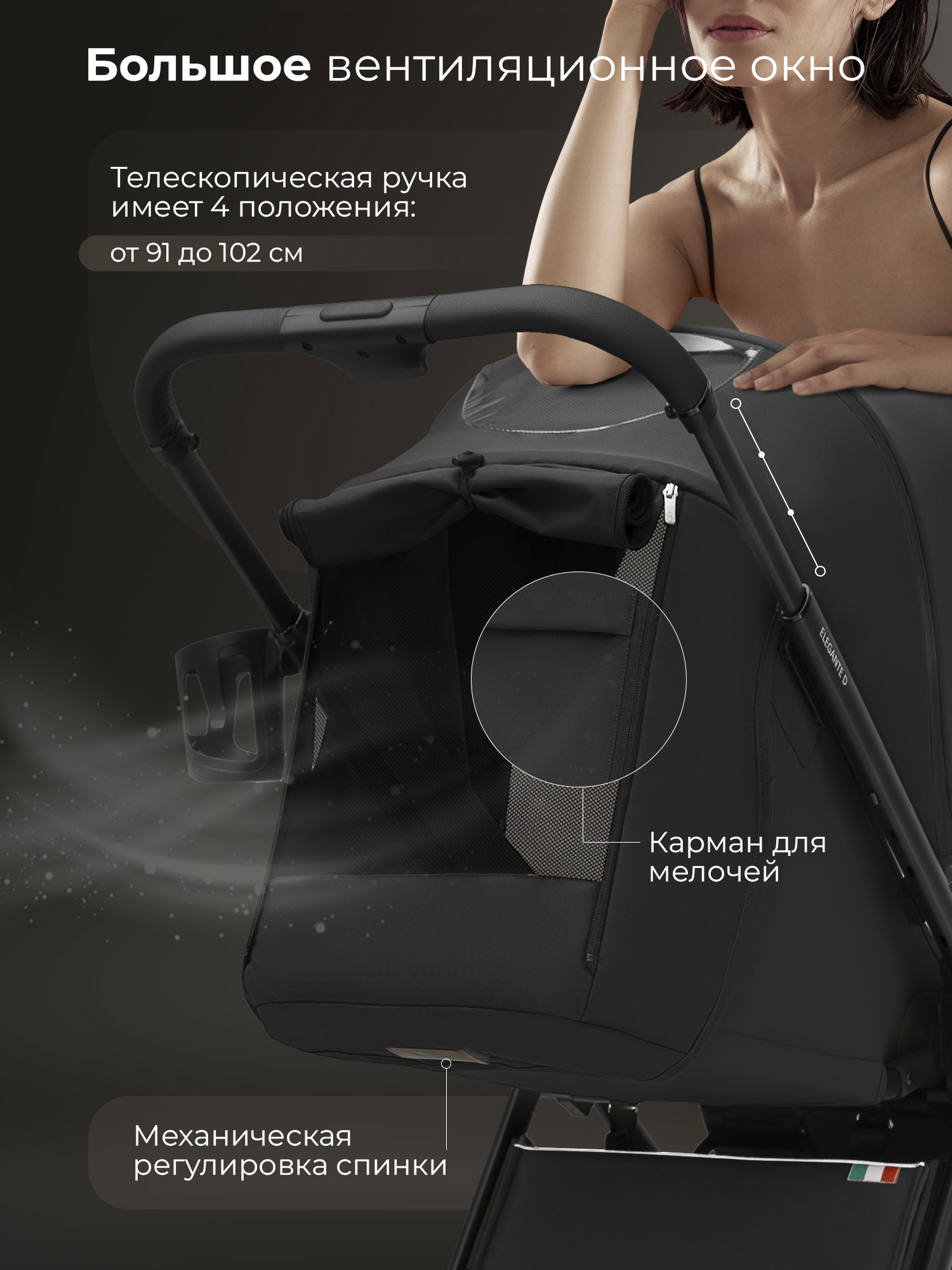 Смотровое окошко на капоре для наблюдения за ребенком и вентиляционное окошко для обеспечения оптимальной циркуляции воздуха;