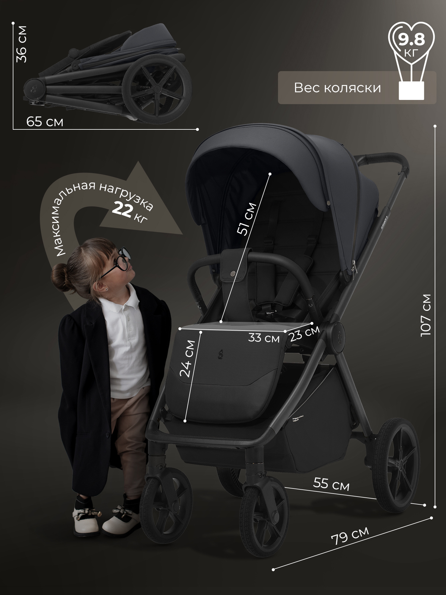Внешние габариты (ДхШхВ), см: 79(по колесам)/91 (по крайним точкам)х55х107