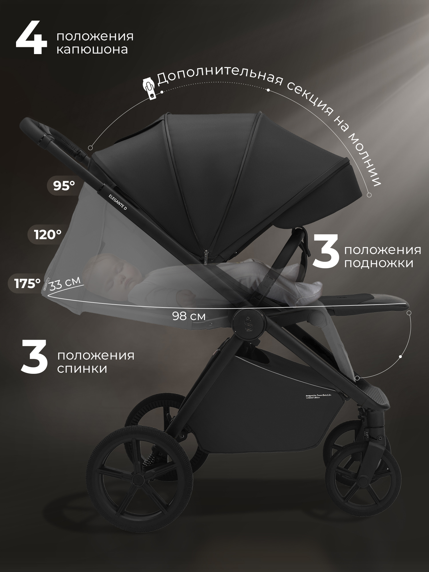 Механическая регулировка спинки в 3 положениях (сидя, полулёжа, лёжа), большое спальное место (98x33 см) и максимальная нагрузка 22 кг делает SBL Elegante идеальном вариантом для детей до 4 лет.