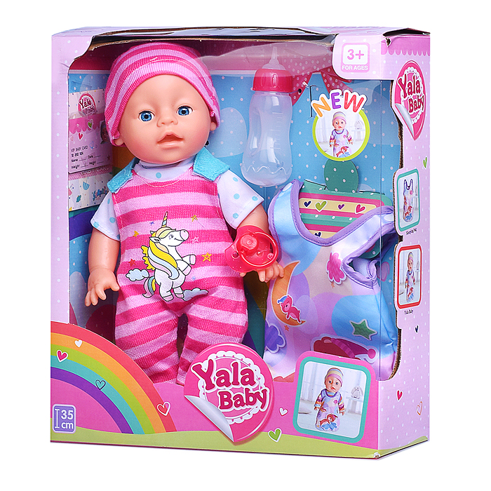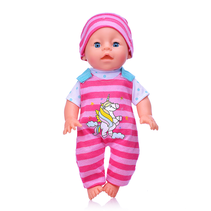 Очаровательный малыш обязательно станет постоянным участником сюжетно-ролевых игр девочки. Размер пупса - 35 см. Туловище игрушки выполнено из пластика; голова, ручки и ножки - из ПВХ. Части тела подвижные. Глазки закрываются. Пупс одет в футболку с коротким рукавом, комбинезон и шапочку из вязаного трикотажа. Пупса можно купать, переодевать, менять подгузник, кормить, поить из бутылочки и садить на горшок. В комплекте аксессуары: соска, бутылочка, горшок, тарелочка, ложечка, подгузник, конверт для малыша. Такая комплектация разнообразит игру и сделает её ещё интереснее и реалистичнее.