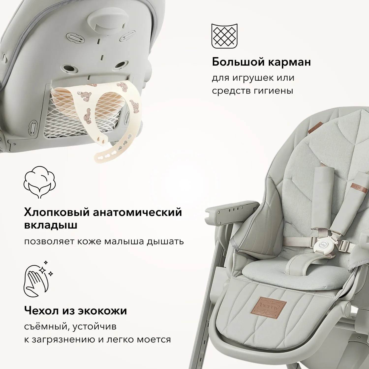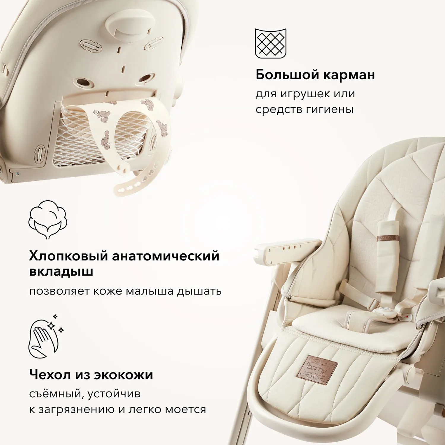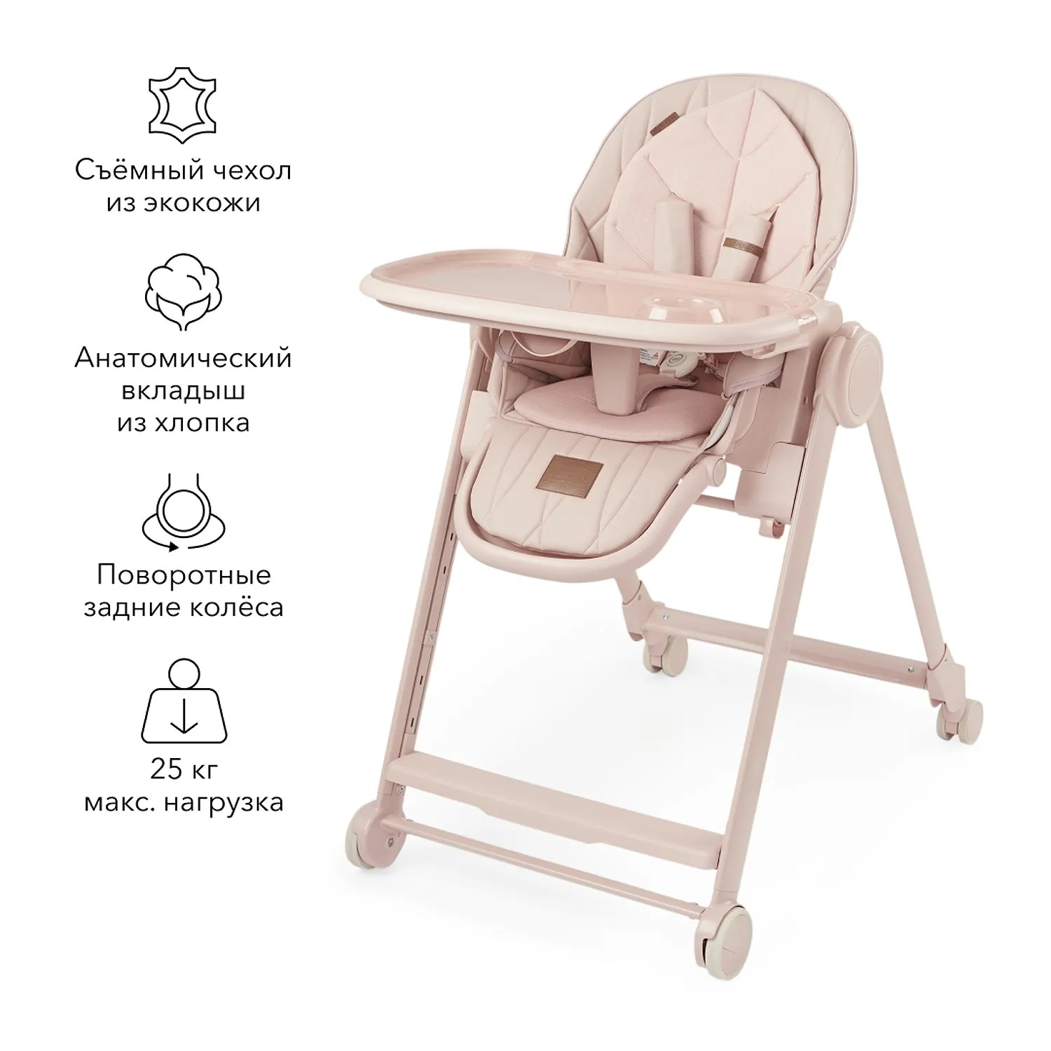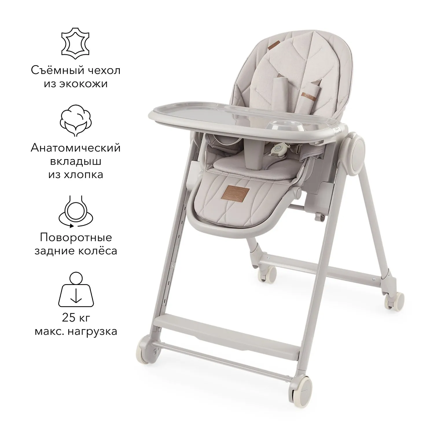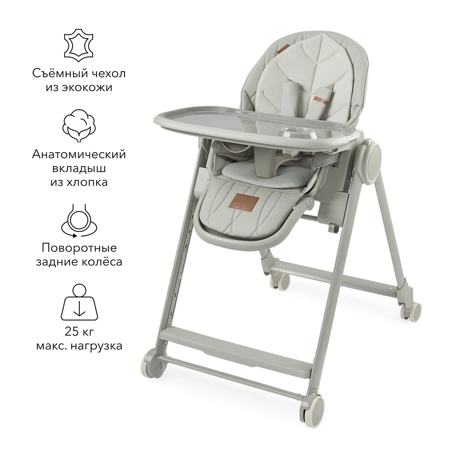BERNY LUX — это продолжение линейки идеальных стульчиков для кормления серии BERNY. Практичный, удобный, стильный и развивающий -он регулируется по высоте сидения, подножки, ступенек и наклону спинки. Малышам будет комфортно в положении «шезлонг», а дети постарше сами заберутся в стульчик с помощью ступеньки. Цельнолитая металлическая рама без спаек и острых углов безопасна и выдерживает повышенную нагрузку до 25 кг. Задние поворотные колеса обеспечивают мобильность и оснащены тормозным механизмом, а передние – не поворачиваются, что добавляет стульчику устойчивости. Сидение из экокожи и мягкая вкладка из хлопка обеспечивают комфорт малышу. В карман на обратной стороне спинки можно положить игрушки или средства гигиены. BERNY LUX впишется в любой интерьер – лаконичный дизайн рамы и чехлов выполнен с учетом современных тенденций.