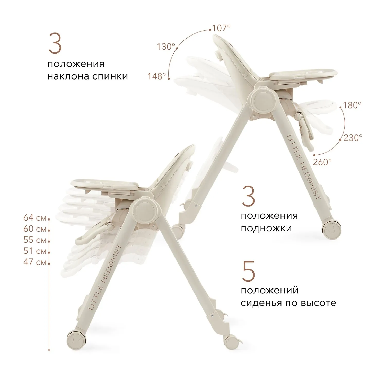 • Регулируемая спинка: 3 положения наклона (107°, 130°, 148°)