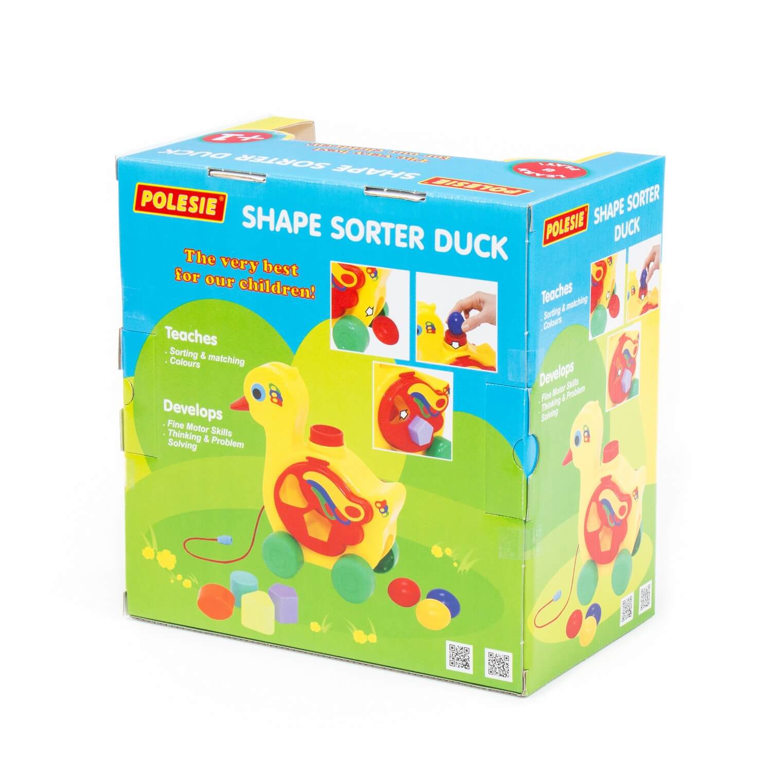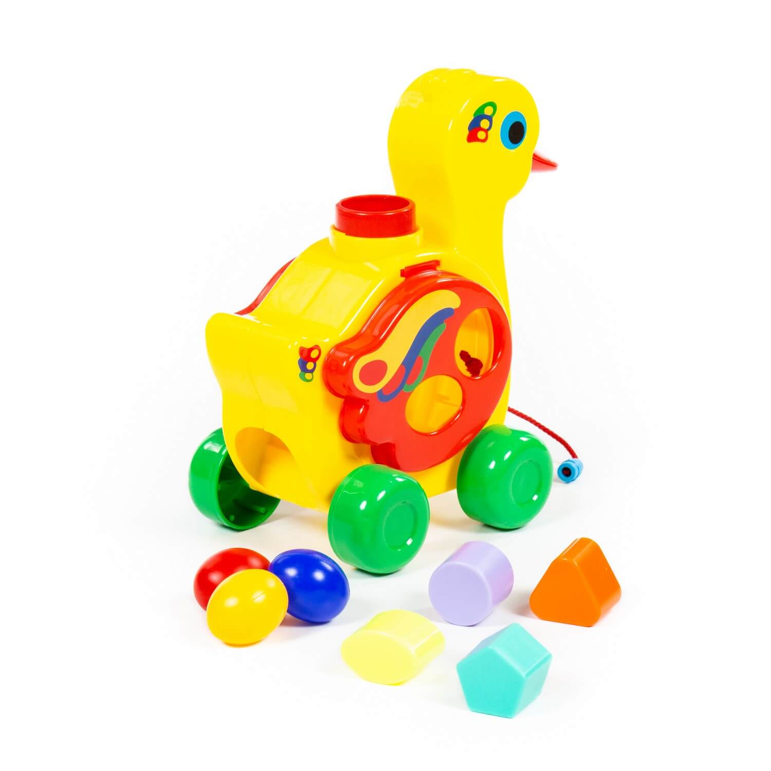 Уточка-несушка имеет яркую расцветку и объединяет в себе функции сортера и каталки. Наличие сортера позволяет ребёнку изучить форму и цвет, решая логическую задачу – подобрать отверстие для каждой фигурки. Возможность катать уточку делает игру еще интереснее, развивая при этом координацию движений малыша.